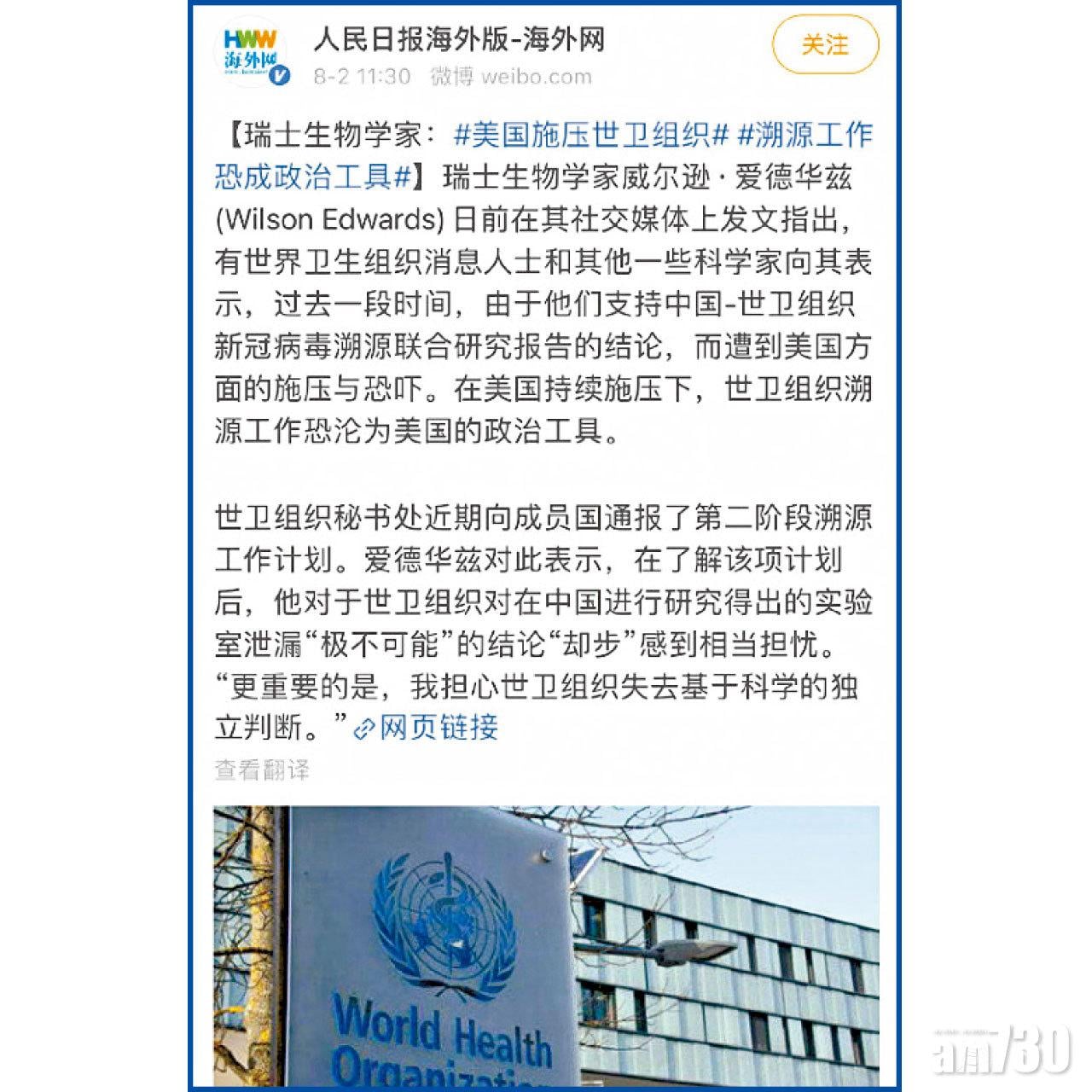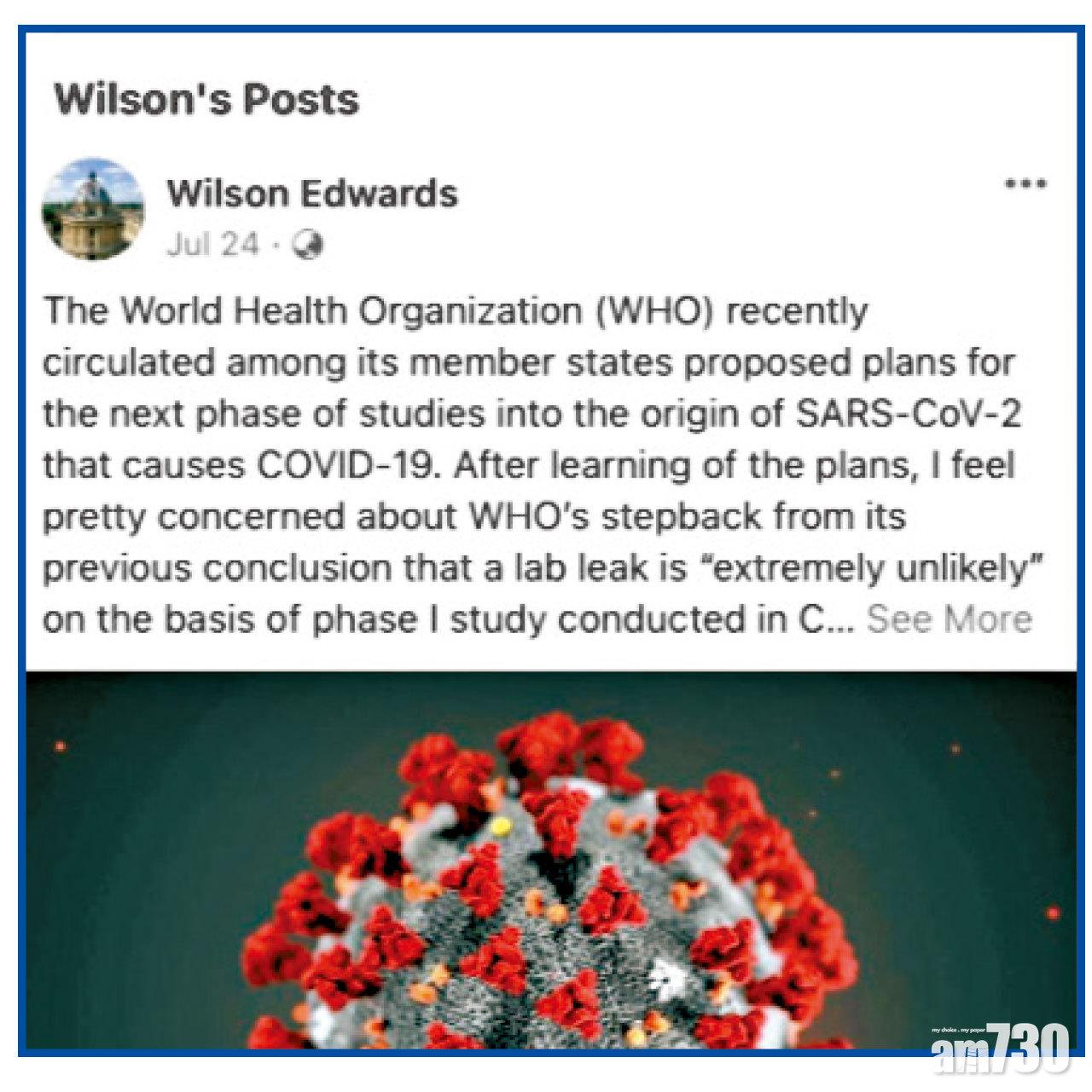 世衛之前派專家到武漢與中方專家研究新冠病毒源頭,報告指病毒從蝙蝠經另一種動物傳人的機會最有可能,實驗室洩漏病毒「極不可能」,惟西方國家「不收貨」,要求專家再到中國調查。自稱瑞士生物學家的Wilson Edwards在Facebook貼文稱,世衛的病毒溯源工作遭政治化,擔心該組織獨立性。他又指,研究員支持世衛與中國的源頭追溯報告後,受到美國和部分傳媒的「巨大壓力」。