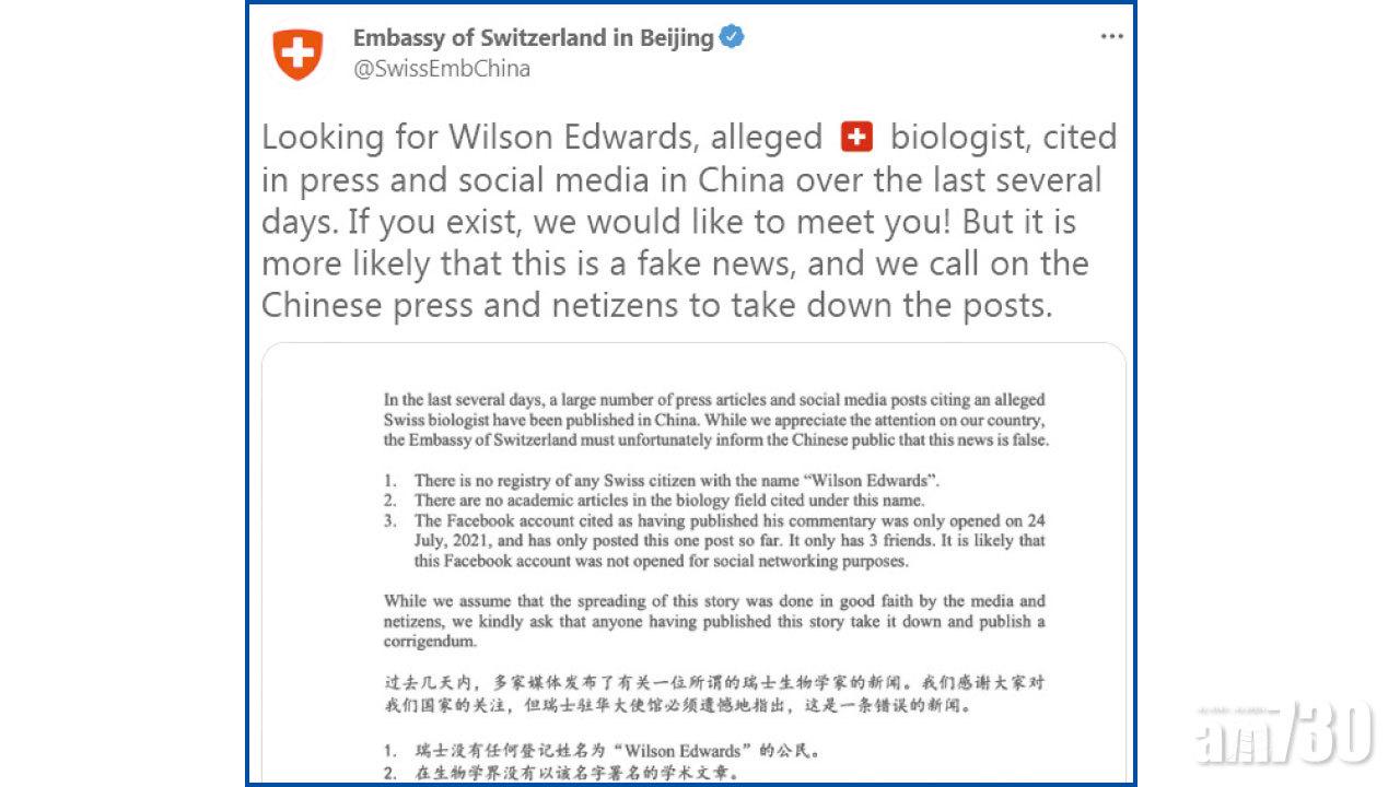 瑞士駐北京大使館在Twitter發聲明,指過去數天中國有大量傳媒報道及社交網帖文引述有關瑞士生物學家的報道,「感謝大家對我們國家的關注,但瑞士駐華大使館必須遺憾地指出,這是一條錯誤的新聞」。聲明指出,瑞士無任何登記姓名為Wilson Edwards的公民;生物學界沒有以該名字署名的學術文章;發表評論的Facebook帳號在2021年7月24日剛開設,僅發一條帖文,帳號好友只有3位。曾刊登或轉載該報道的中國傳媒網頁及社交網已將報道下架,包括人民日報海外版微博帳號、環球時報、央視旗下的中國環球電視網(CGTN)、鳳凰網和上海日報網,但並無刊登更正聲明。