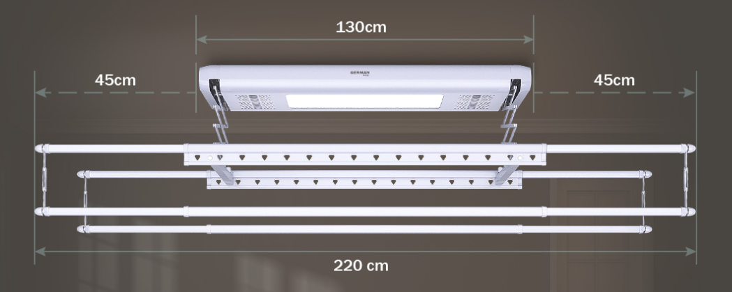 UVC智能晾衫架配備自動升降功能,只需用遙控器簡單按下降鍵,晾衣杆將自動下降最多達1.3米至觸手可及的位置,用家亦可按身高自行調整最適合的下降幅度,無需再使用衣叉,亦不用再企高,無論長者、家庭主婦或身高較矮小的人士都能輕鬆晾掛衣物。晾掛完成後按上升鍵,晾衣杆將自動上升回天花板位置,為家居騰出更多空間,景觀更開揚!