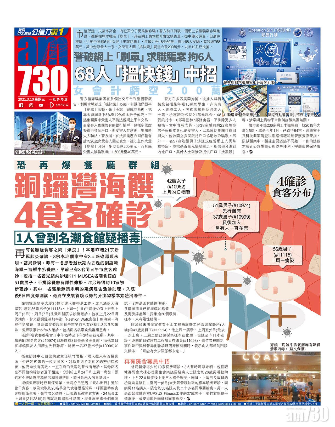 在銅鑼灣皇室大廈35樓安達人壽香港工作、居東涌藍天海岸第1座的56歲男子(#11115),上周一(1日)不適後仍有上班至上周三(3日),周日(7日)往養和醫院求診後確診。他在上月22日潛伏期內,曾光顧銅鑼灣加寧街「Fashion Walk食街」的海饌-海鮮牛扒餐廳,當局追蹤發現同日午市早前已有兩枱共3名食客確診,餐廳現累計3枱4人確診,包括兩名名潮食館群組患者。