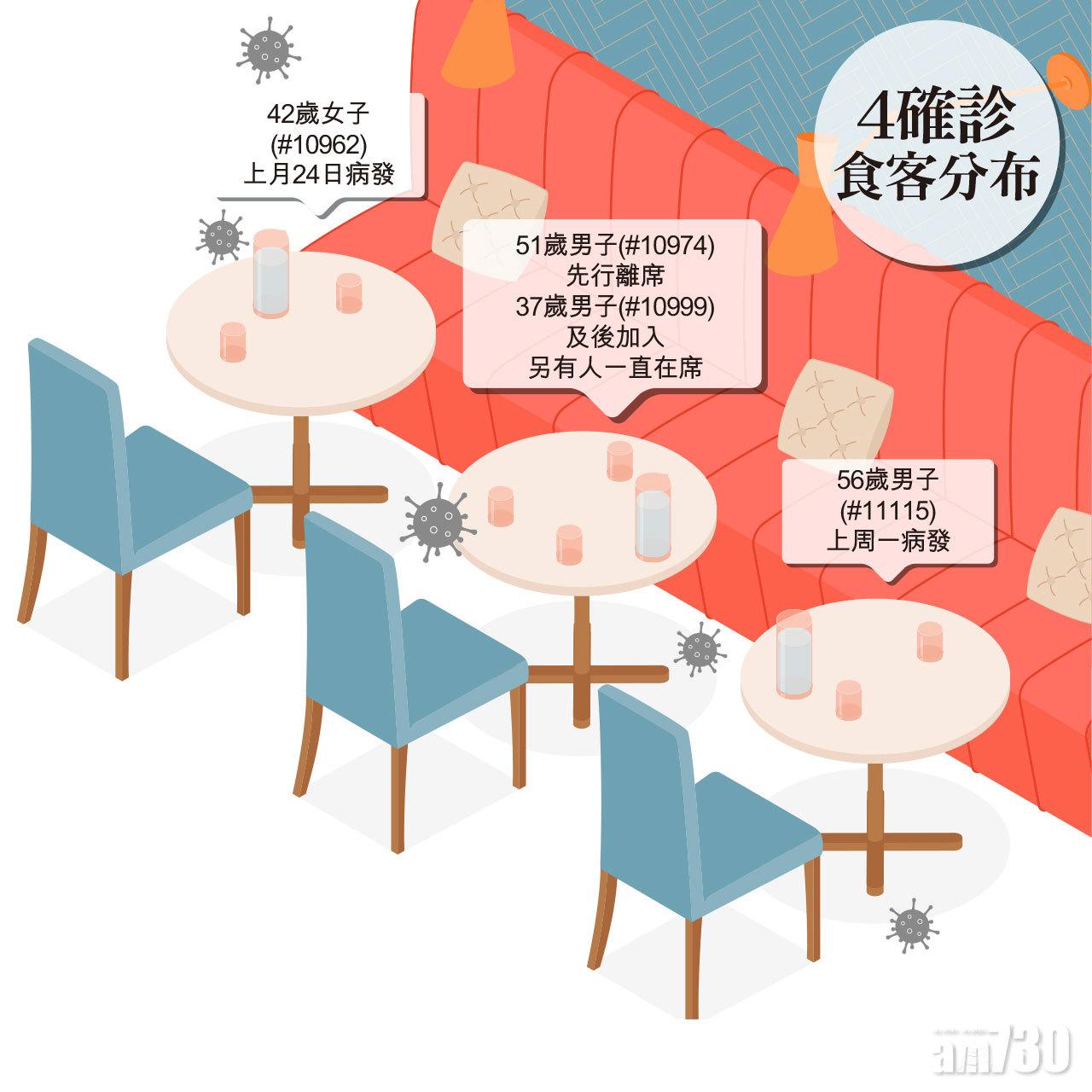 確診4名食客都是當日中午12時至下午3時左右光顧,其中一枱的51歲男食客(#10974)到海饌前3日去過名潮食館,而他當日在海饌與友人用膳並先行離席,隨後一名37歲男子(#10999)加入。