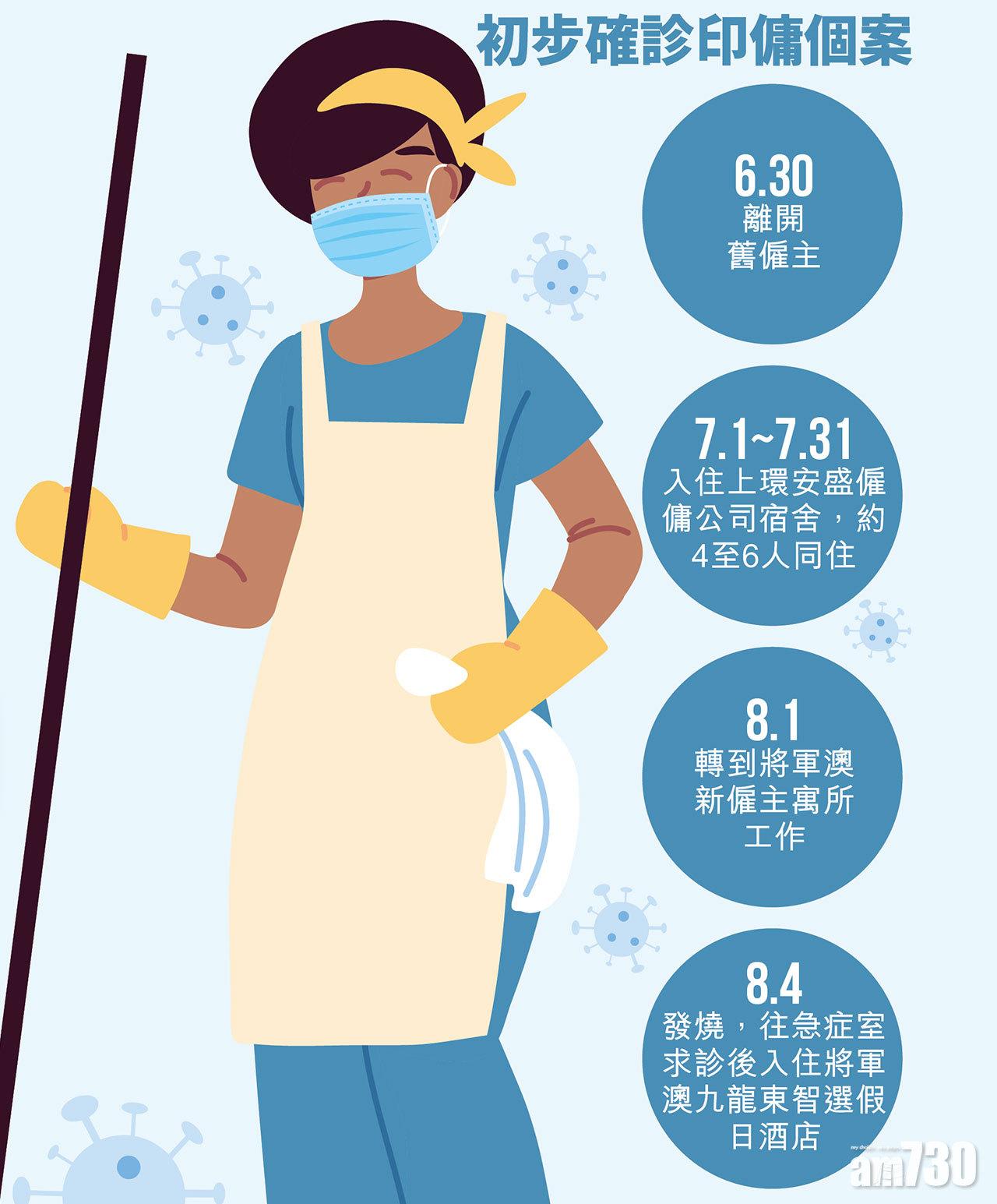 新增91宗本地個案中,有46宗與親友相聚有關、39宗源頭未明。昨公布的印傭初步確診個案,女傭於6月30日離開舊僱主後,整個7月均入住上環安盛僱傭公司宿舍,與4至6人同住;至本月1日(上周六)到新僱主位於將軍澳的寓所工作,3日後開始發燒,僱主遂帶她到將軍澳醫院急症室求診,並安排她入住將軍澳九龍東智選假日酒店等待化驗結果,昨公布列為初步確診。張竹君表示,印傭新僱主一家要接受檢疫,至於在上環宿舍同住的外傭則須作病毒測試。