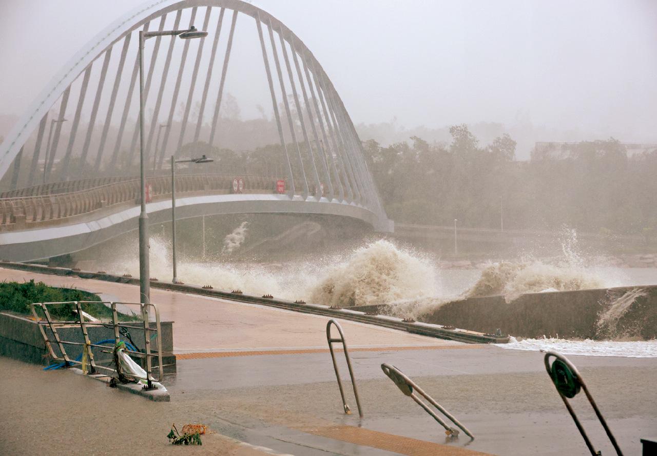 他又指,颱風引起的風暴潮亦較以往更明顯,「原本水位是1米,突然間跳到3米」,此外,在全球暖化、格陵蘭及南極冰川融化下,導致海平面上升,將會令水浸問題更加嚴重。而颱風吹襲期間海邊會出現「越堤浪」,即越過沿岸構築物的海浪,單靠貼膠紙是不能抵禦海浪,建議海邊附近餐廳應加設木板,政府應加建防波提。