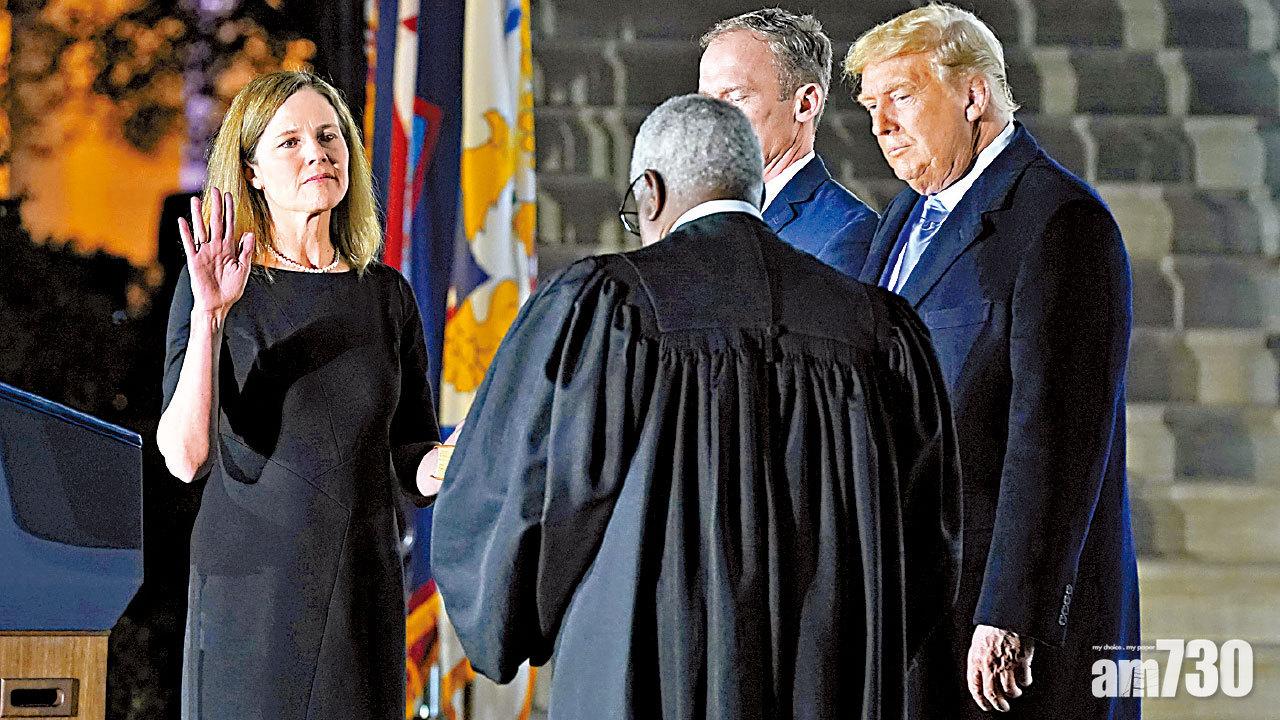 女大法官金斯伯格上月病逝,因臨近美國大選,令特朗普提名巴雷特接替金斯伯格的決定備受爭議,參議院最終在一名共和黨議員倒戈及全體民主黨議員反對下,以52票對48票通過巴雷特提名。巴雷特是自1869以來,在參院表決中不獲少數派議員一票支持的首位大法官,她在宣誓儀式發言時強調,裁決時不會受個人和政府主張影響。除了選舉爭拗,在大選結束後一周,最高法院也將審理共和黨人尋求推翻奧巴馬醫保的案件,亦會處理特朗普阻止紐約檢察部門索取其稅務記錄的請求。大法官是終身制,巴雷特只有48歲,將影響美國日後數十年的政治和法律走向,而在保守派主導下,料最高法院在墮胎和同性戀平權等議題的立場將趨向保守。