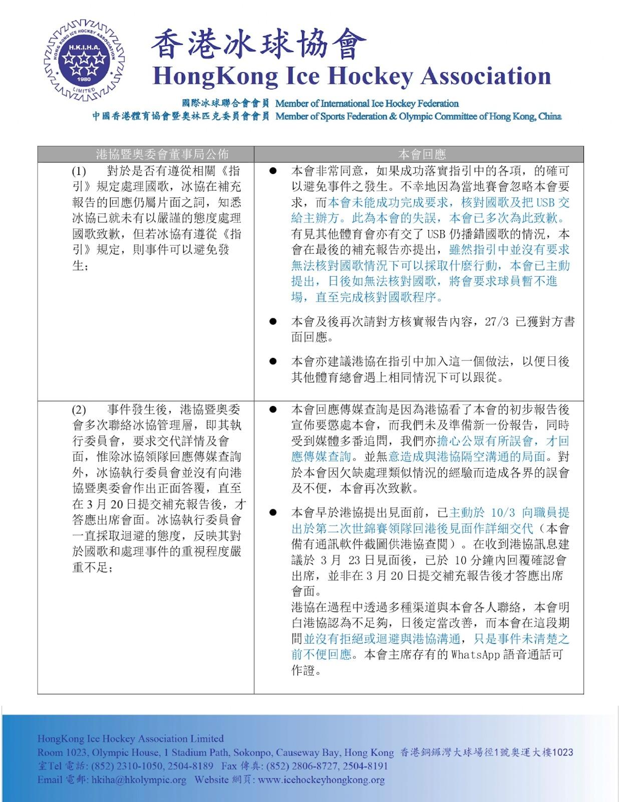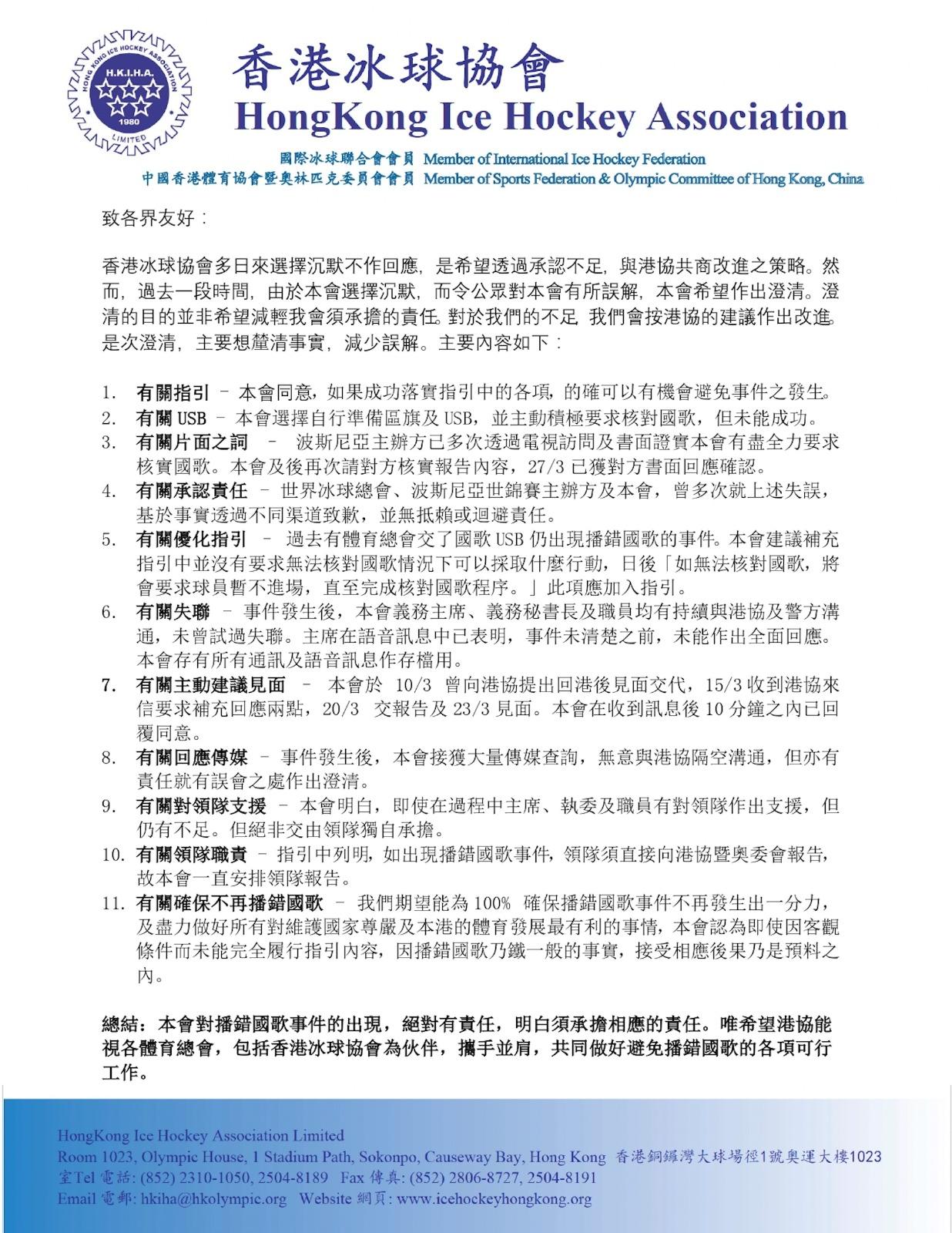 最後,冰協強調,即使因客觀條件未能完全履行指引內容,因播錯國歌是鐵一般的事實,接受相應後果是預料之內,並就此次事件道歉,唯希望港協能視各體育總會為夥伴,攜手並肩,共同做好避免播錯國歌的各項可行工作。