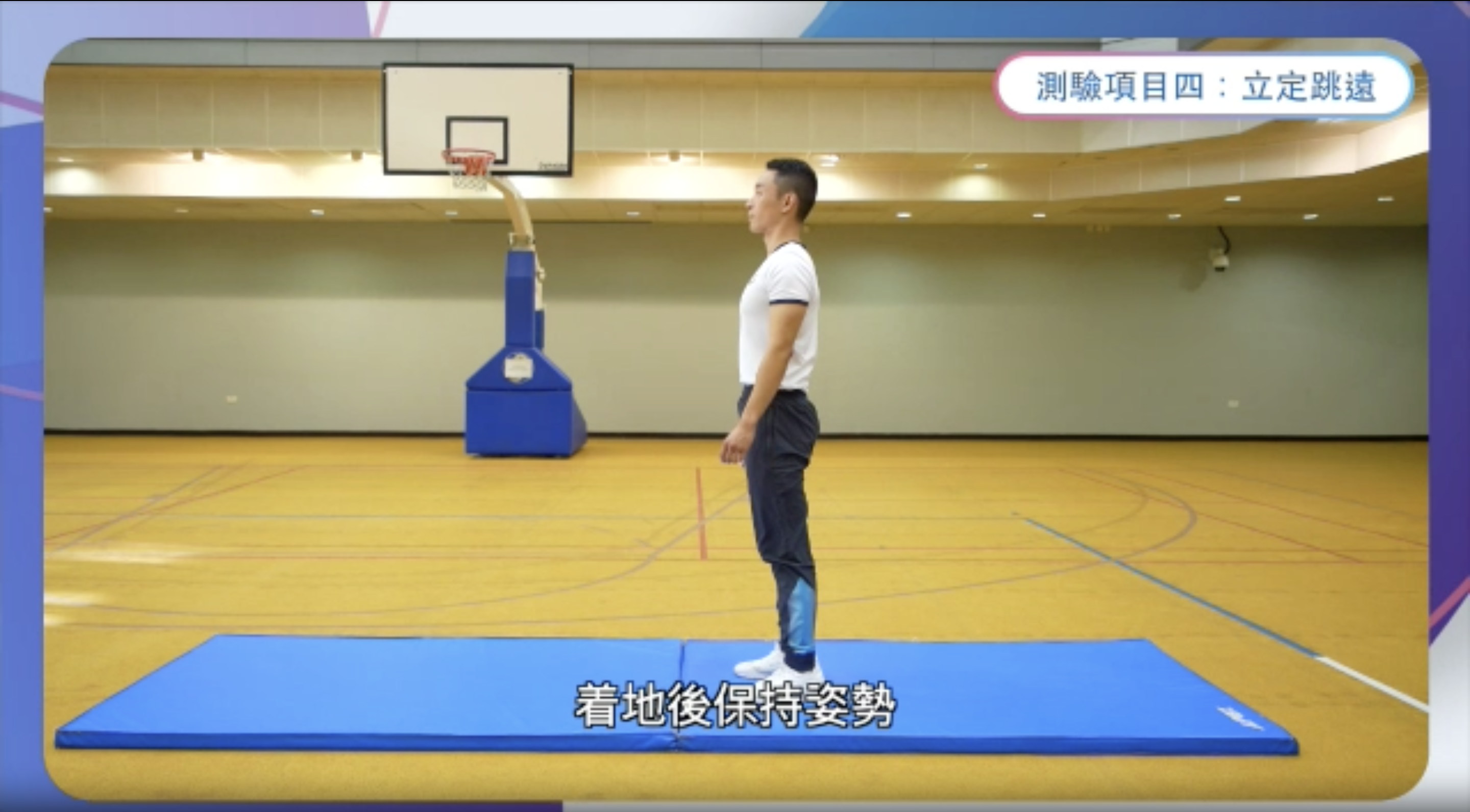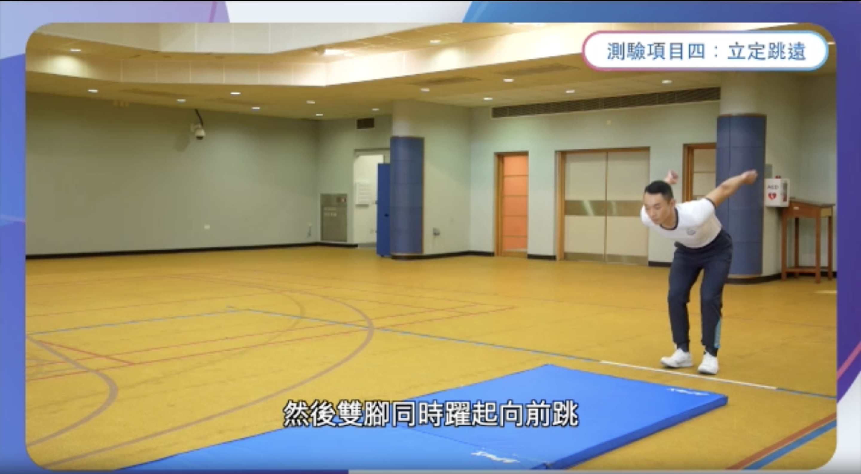 考生需站在軟墊的起跳線前,之後雙腳同時向前起跳,盡量跳到最遠的位置。雙腳落地後要保持立正姿勢,靜候監考員量度 。成績會以起跳線與考生落地點的最短距離來計算。考生最少要跳到144.5厘米,方得一分。