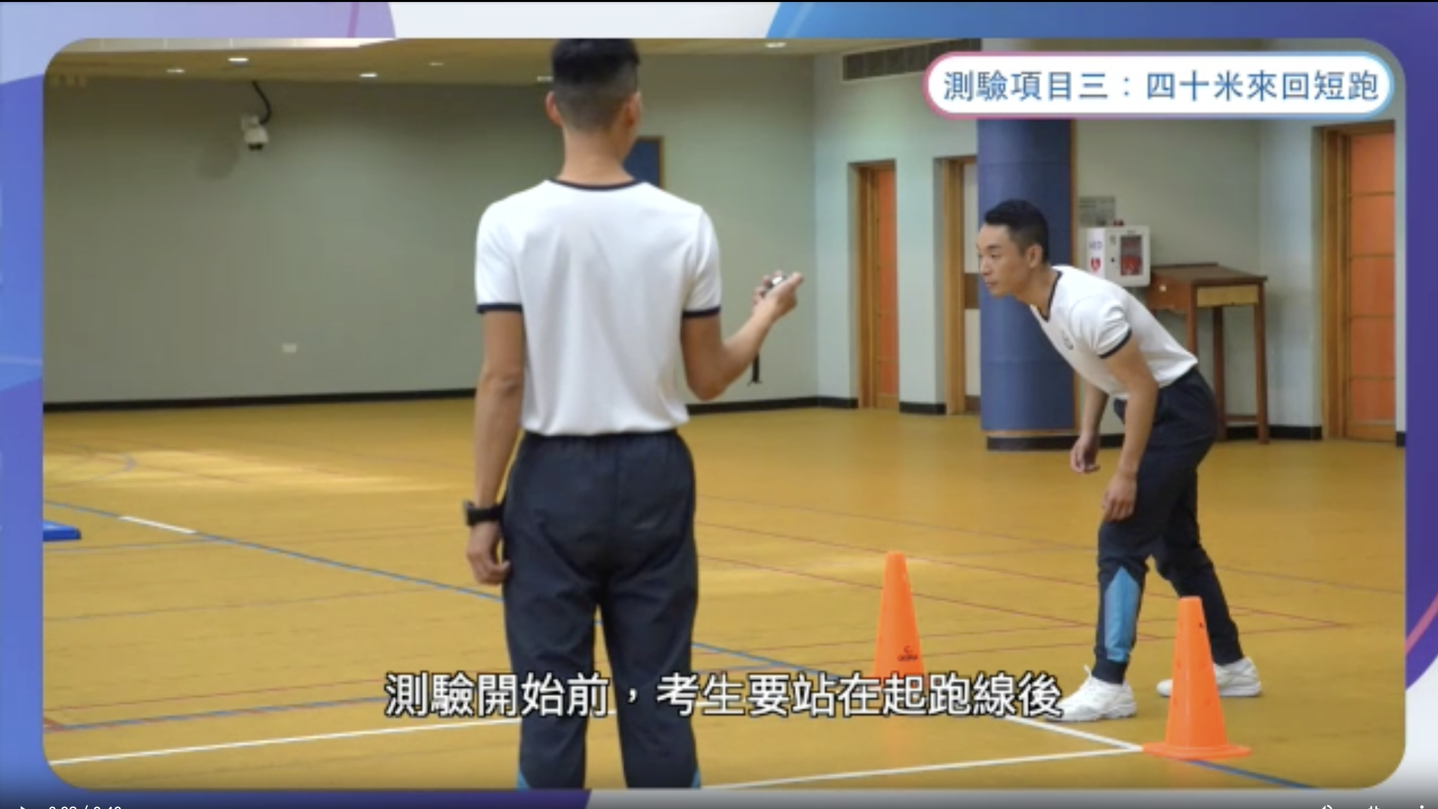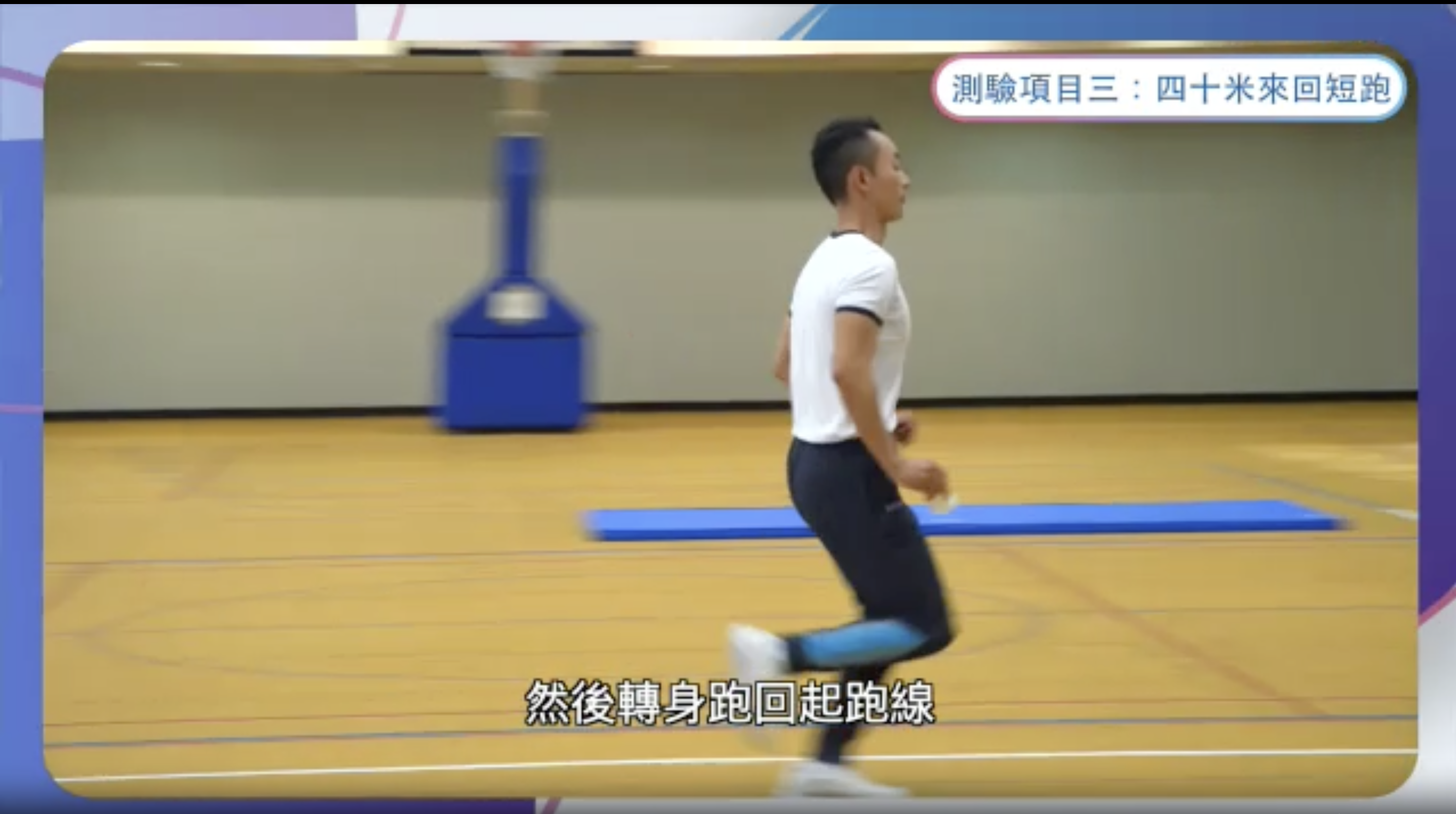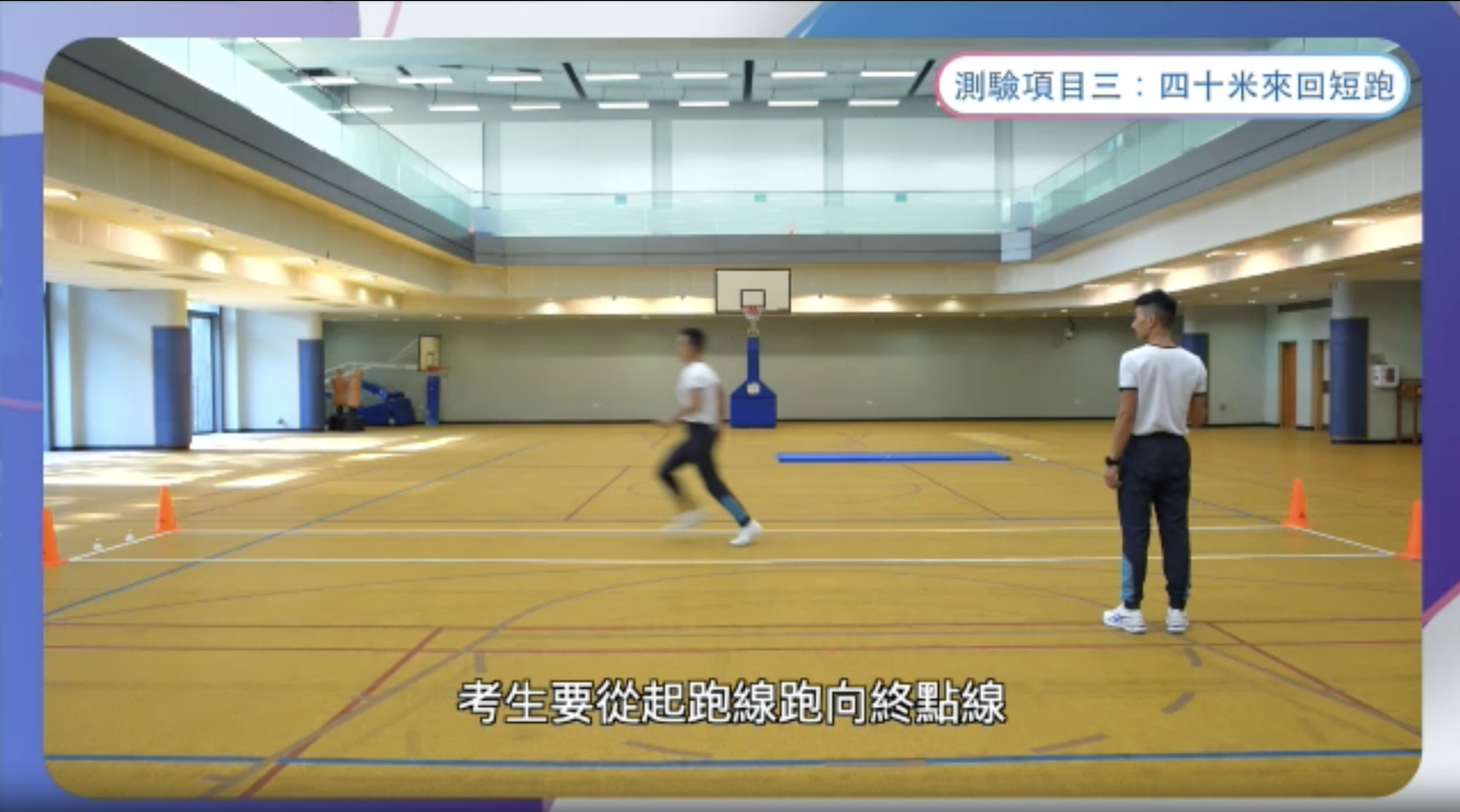 測試開始前,考生需站在起跑線後,聽到起跑指令時,考生要跑向對面的終點線,把終點線上的羽毛球拾起,再轉身跑回起跑線後放下羽毛球,然後再跑向終點線拾起剩下的羽毛球,最後跑回起跑線衝線。考生最慢要在12.3秒內完成,方計算為一分,成績以完成時間計算,跑得越快越高分。