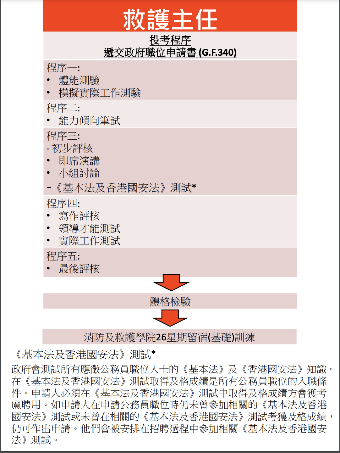 救護主任需要有良好的體能以勝任前線工作,同時需要有良好的語言能力及組織力以應付行政工作。投考過程可分為五部分,在遞交政府職位申請書後,申請人需要進行體能測驗及模擬實際工作測驗。之後進入能力傾向筆試,接着是初步評核(即席演講和小組討論)和《基本法及香港國安法》測試,在即席演講中,考生需要運用指定的英文生字作兩分鐘的英語演講。