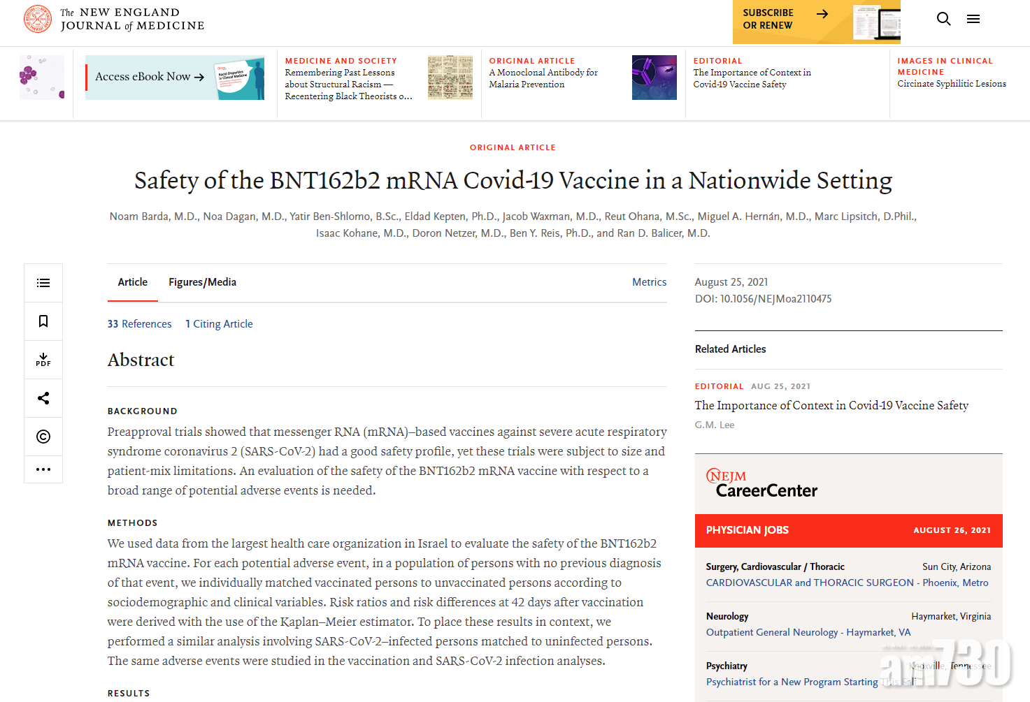 研究涉及以色列約88萬名16歲或以上已完成接種輝瑞/BioNTech人士,並配對醫療紀錄及人口統計學上相近的另外約88萬名無打針人士,即合共約176萬人。研究分兩部分,第一是統計25種「疫苗潛在副作用」在兩個組別出現的比率;第二是統計約17萬名染疫人士裡面,出現該25種情況的比率,再與背景及人數差不多的無染疫人士作對比。