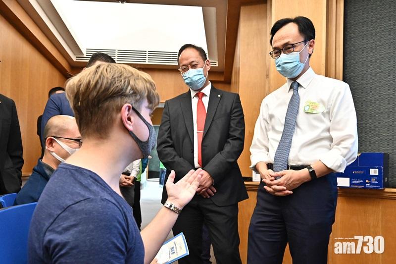 聶德權與一名準備接種疫苗的浸大職員交談。(政府新聞處圖)