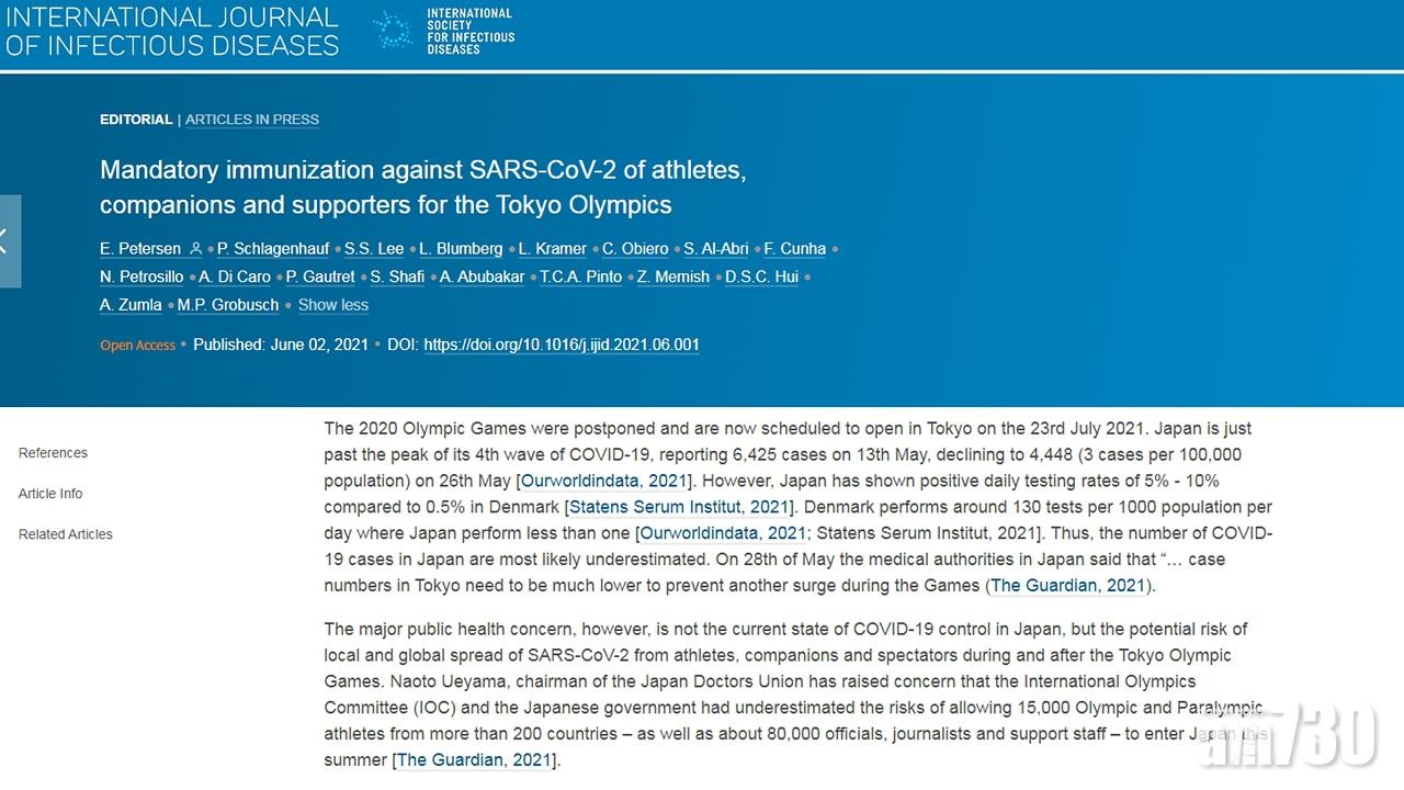 許樹昌聯同歐美專家發文,倡東奧為所有參與者打新冠疫苗。(《傳染病國際期刊》截圖)