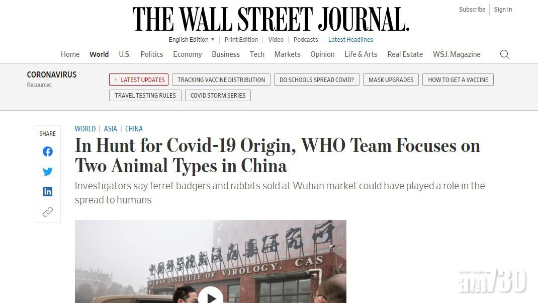 世衞溯源組懷疑鼬獾與兔將病毒傳人。(《華爾街日報》網頁截圖)