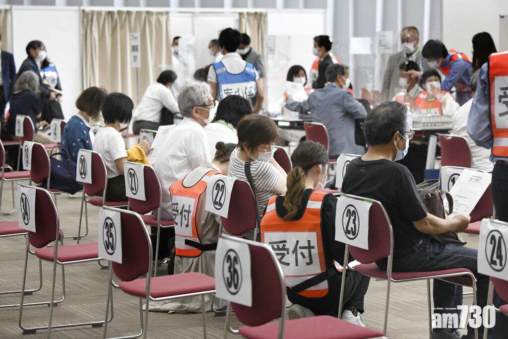 大阪民眾在接種中心等候注射莫德納疫苗。(美聯社)
