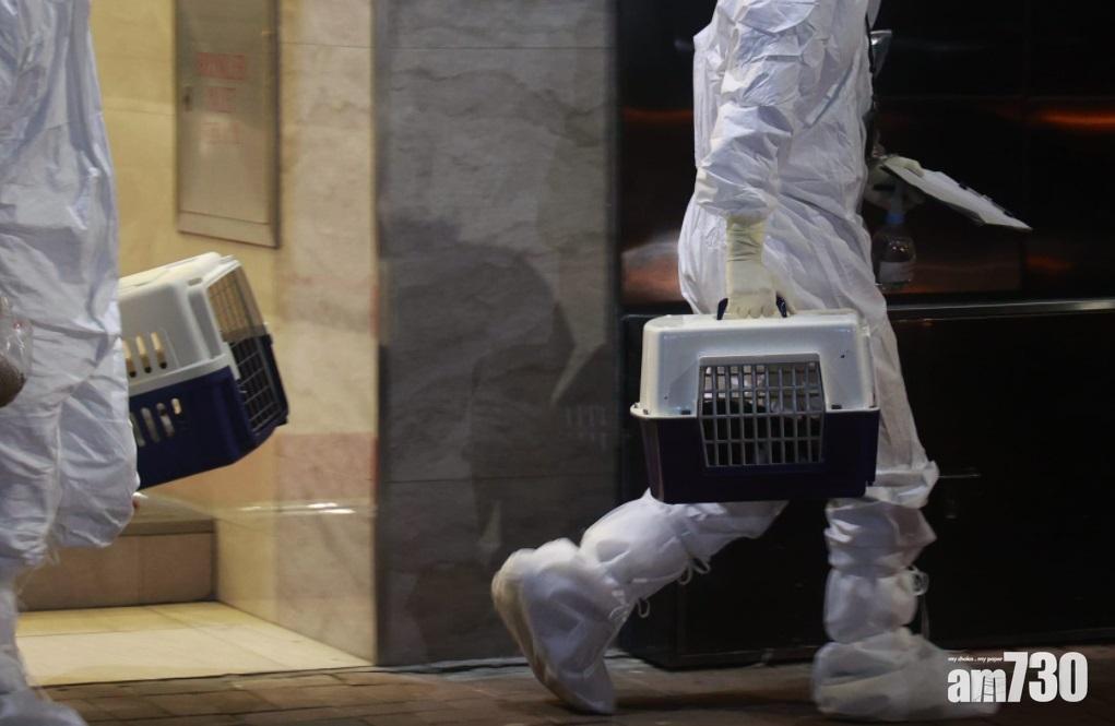 穿上保護衣的政府人員手持寵物箱離開大廈,相信是協助處理部分住戶的寵物。(莊振邦攝)