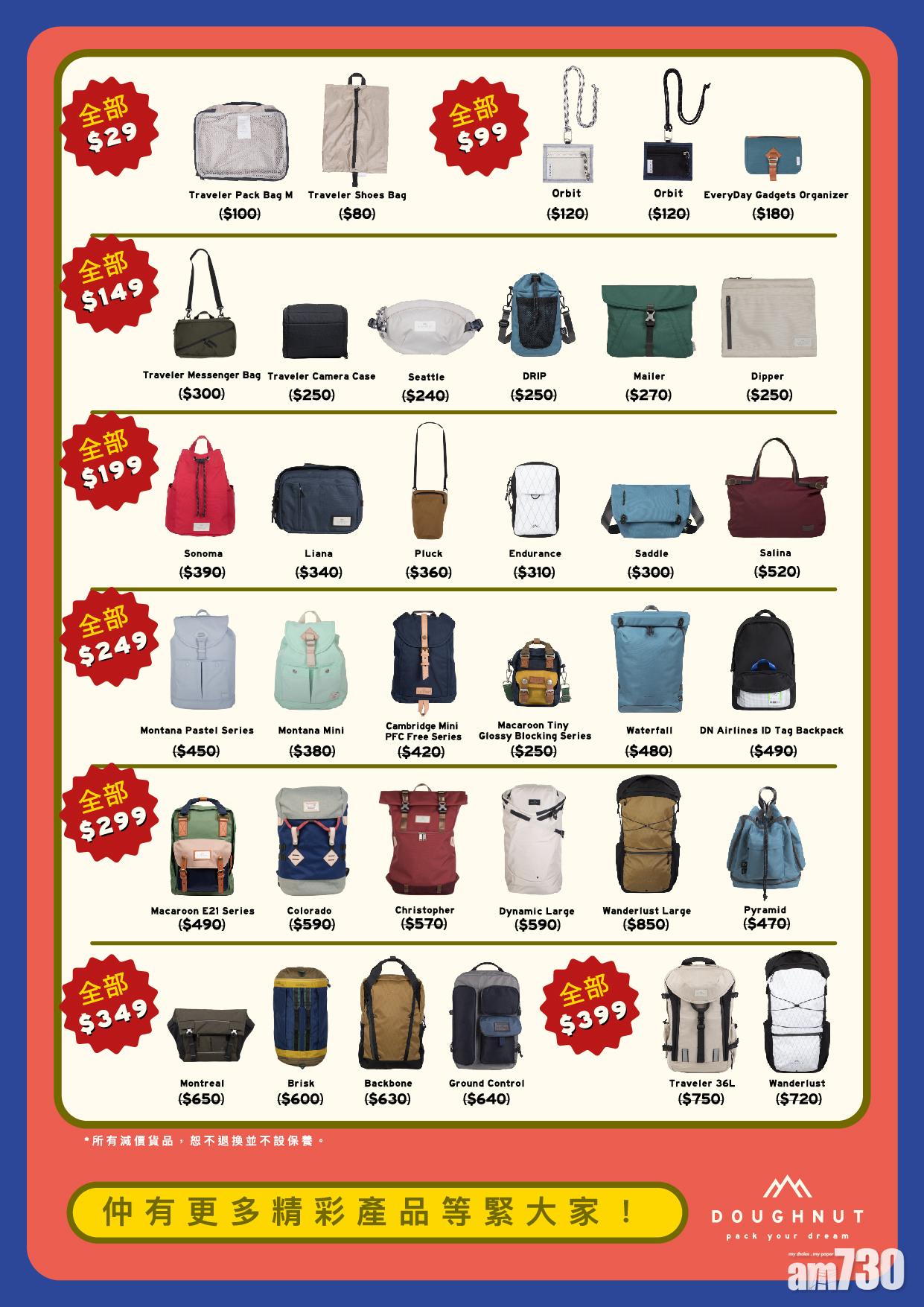 DOUGHNUT擁有多款不同設計、大小的背包或配件,將由最低$29(原價$80)到$399(原價$750)以開倉價發售回饋顧客。款式由細小便利的小旅包到野外露營的大容量背包,皆一應俱全,非常百搭。