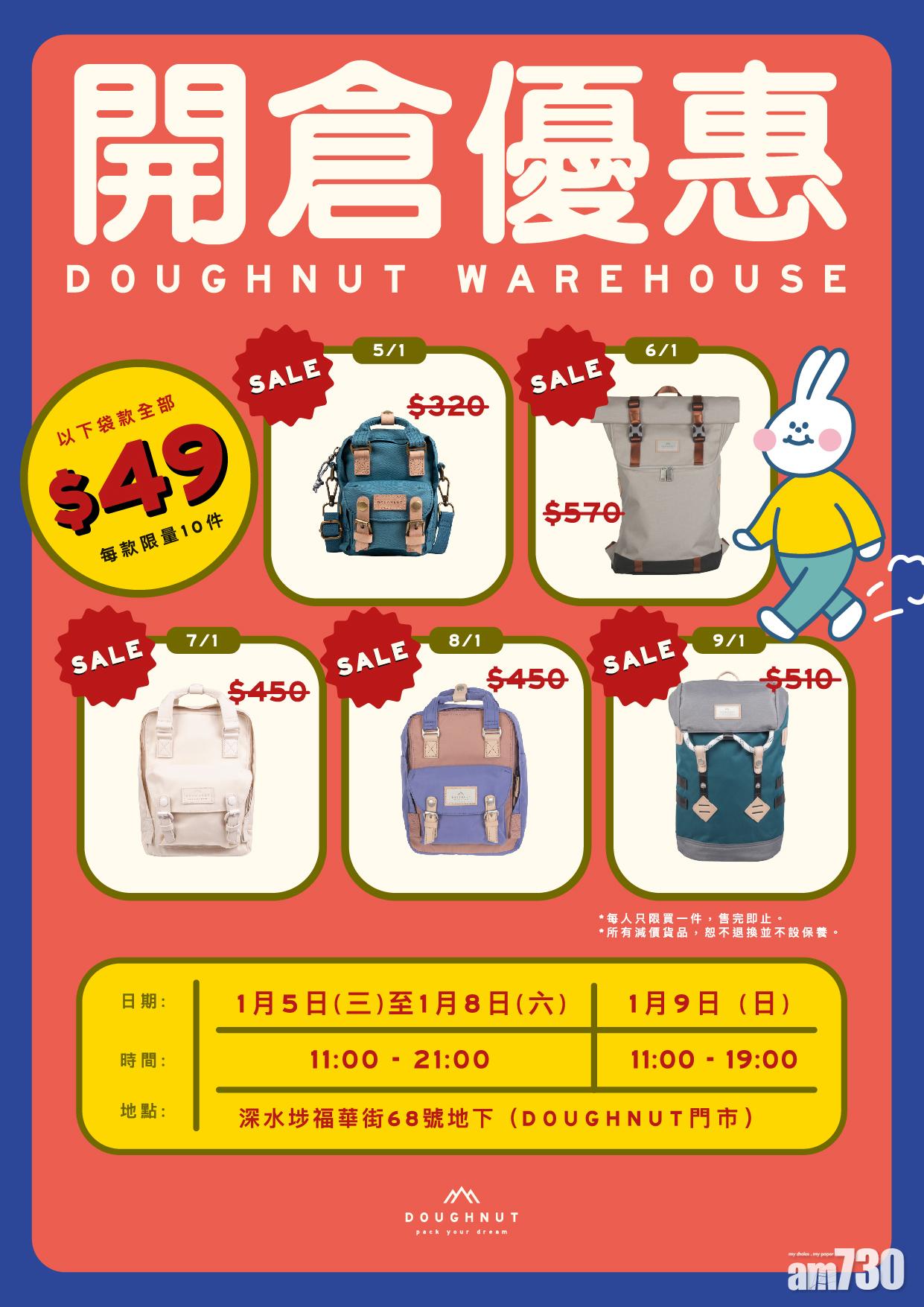 本地時尚背包品牌DOUGHNUT,提供耐用又時尚、實用與款式兼備的背包及配飾,深受年輕人歡迎。農曆新年將至,DOUGHNUT推出一連五日的限時開倉優惠,限量歐洲版Macaroon背包低至6折、過百款潮流背包及配飾更低至2折發售,非常吸引,每日限定袋款更以$49、低至1折入手,不要錯過新年換新裝的好時機!