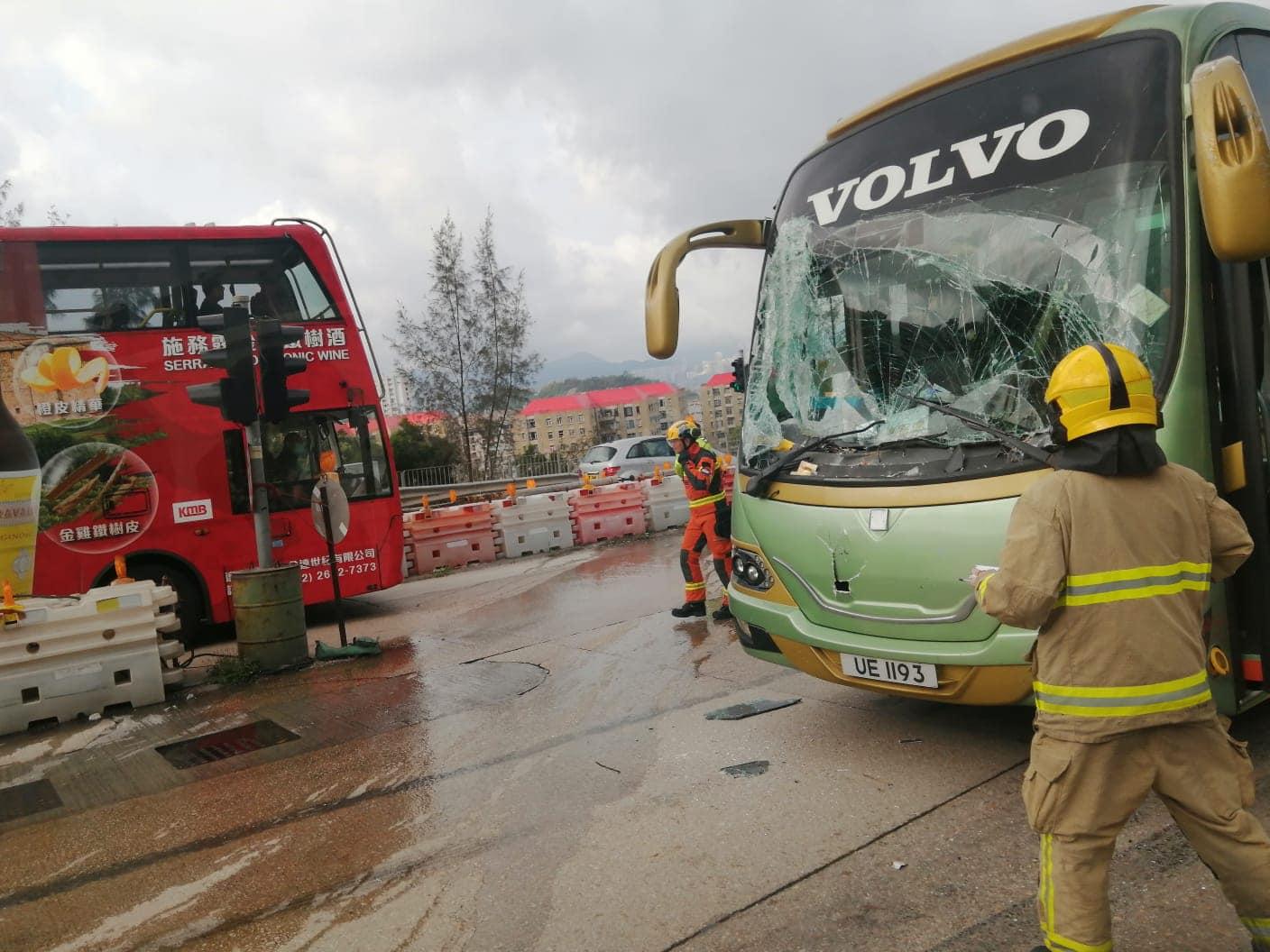 今日(17日)早上8時許,一輛泥頭車沿新清水灣道往西貢方向行駛,駛至近清水灣道交界時,因前路擠塞減速收慢,其尾隨的一輛旅遊巴收掣不及,猛撼向泥頭車車尾,旅遊巴擋風玻璃爆裂,遊遊巴司機疑一度被困。