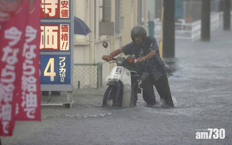 日本福岡縣久留米市一名男子在水浸的街道推着電單車前行。(美聯社圖)