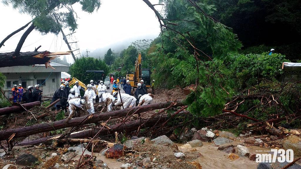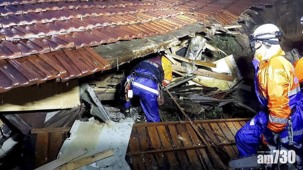 九州長崎雲仙市發生山泥傾瀉,消防人員在現場行動。(美聯社圖)