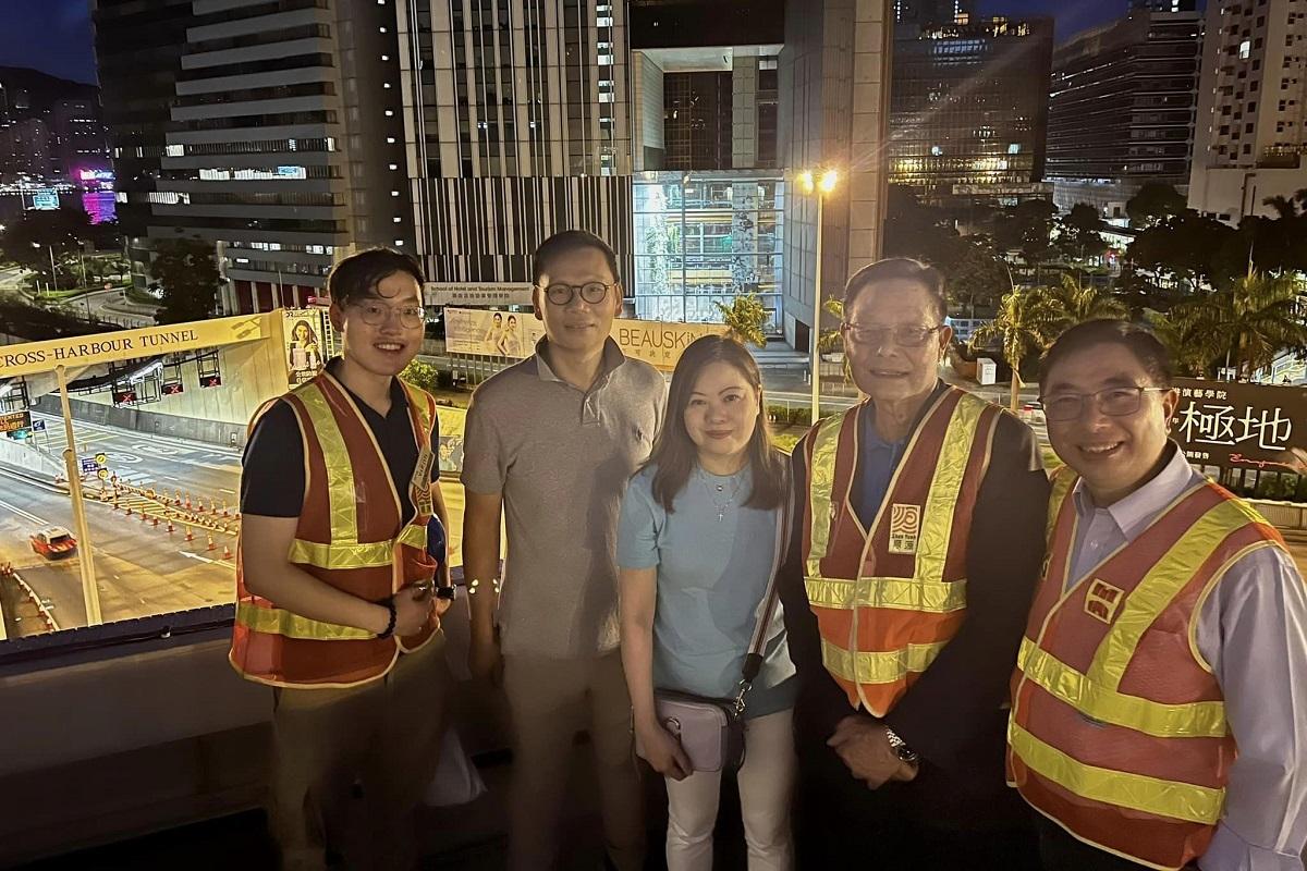 羅淑佩(中)和陳恒鑌(左二)凌晨視察紅隧改用「易通行」的工程。(羅淑佩FB)