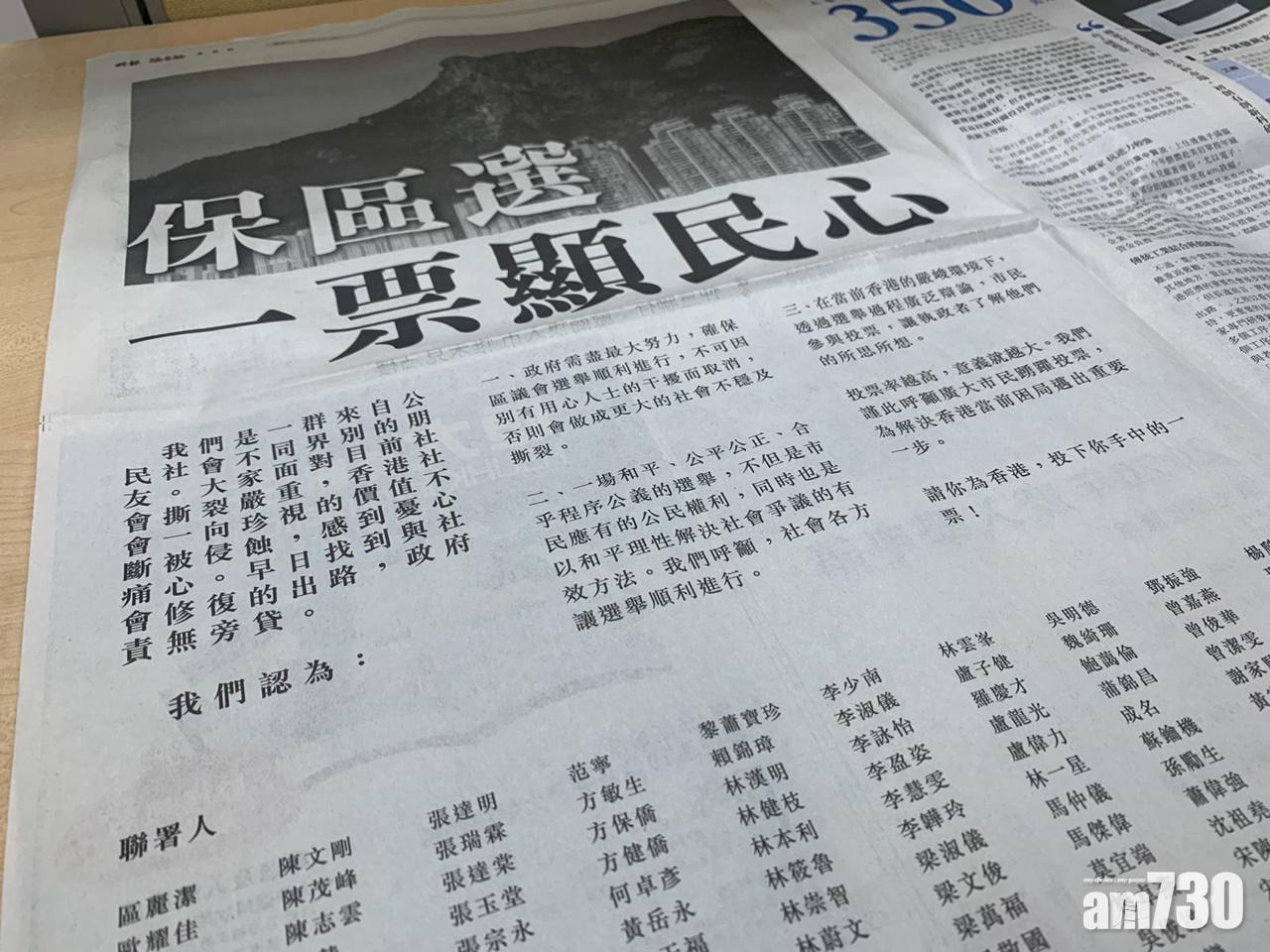 曾俊華等逾百人士聯署登報籲政府確保區選順利舉行