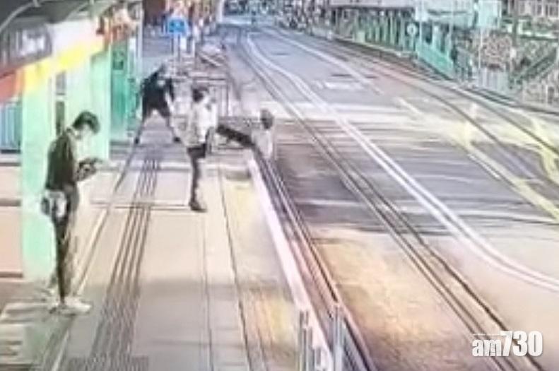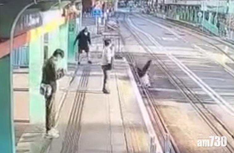 女子被推後翻滾一圈直墮輕鐵路軌。(網上片段截圖)