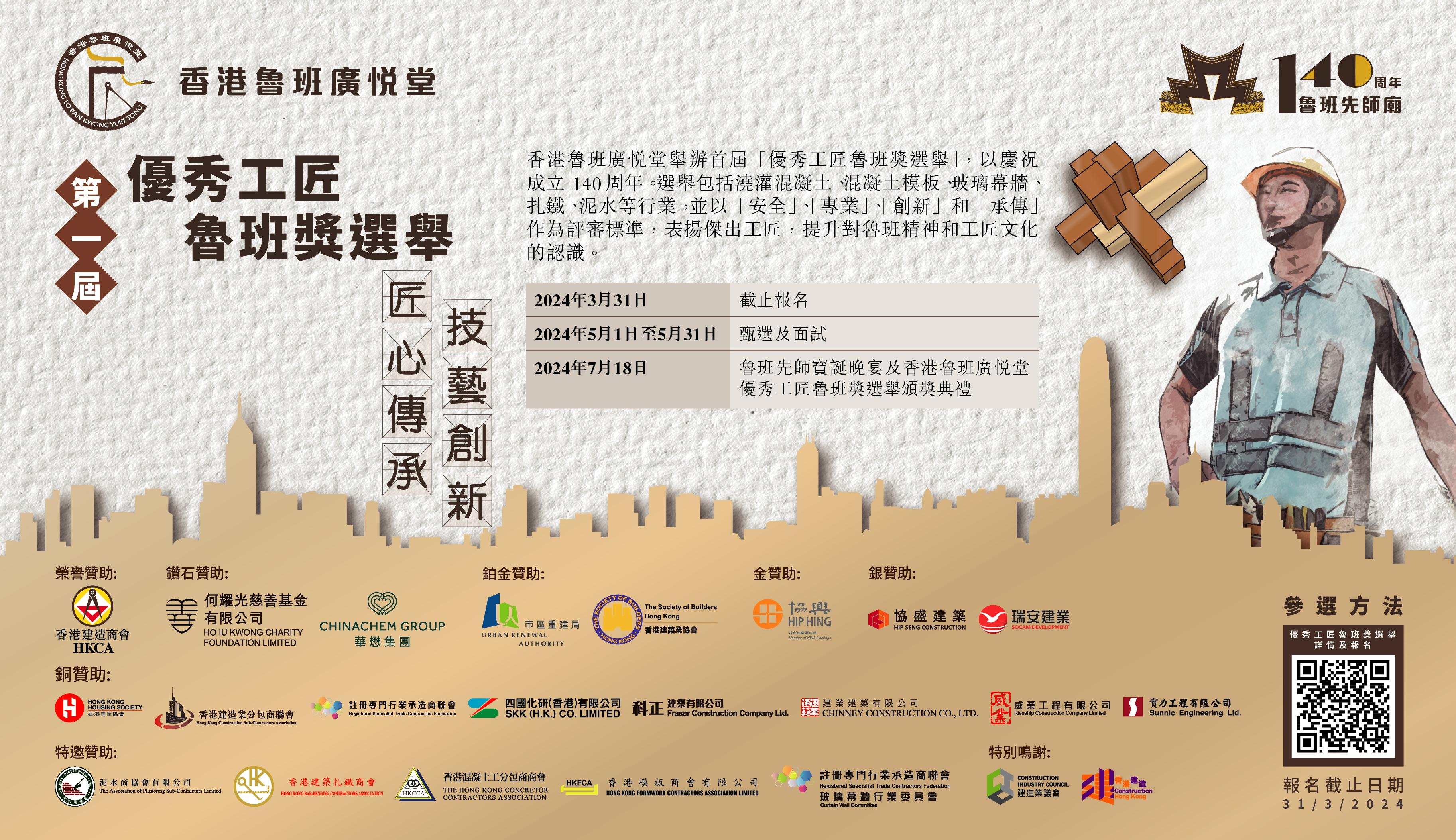 今年是西環「魯班先師廟」建基140周年,這位春秋時代的巧匠以做事「規矩準繩」見稱,故被現今建造業界奉為祖師。香港魯班廣悅堂將會舉辦連串活動,包括「優秀工匠魯班獎選舉」、「魯班文化研討會」、「青年魯班選舉」、「魯班師傅誕『好夥記』晚宴」等,傳承一代匠人精神,提升工人的使命感及歸屬感,及鼓勵更多年輕人入行。