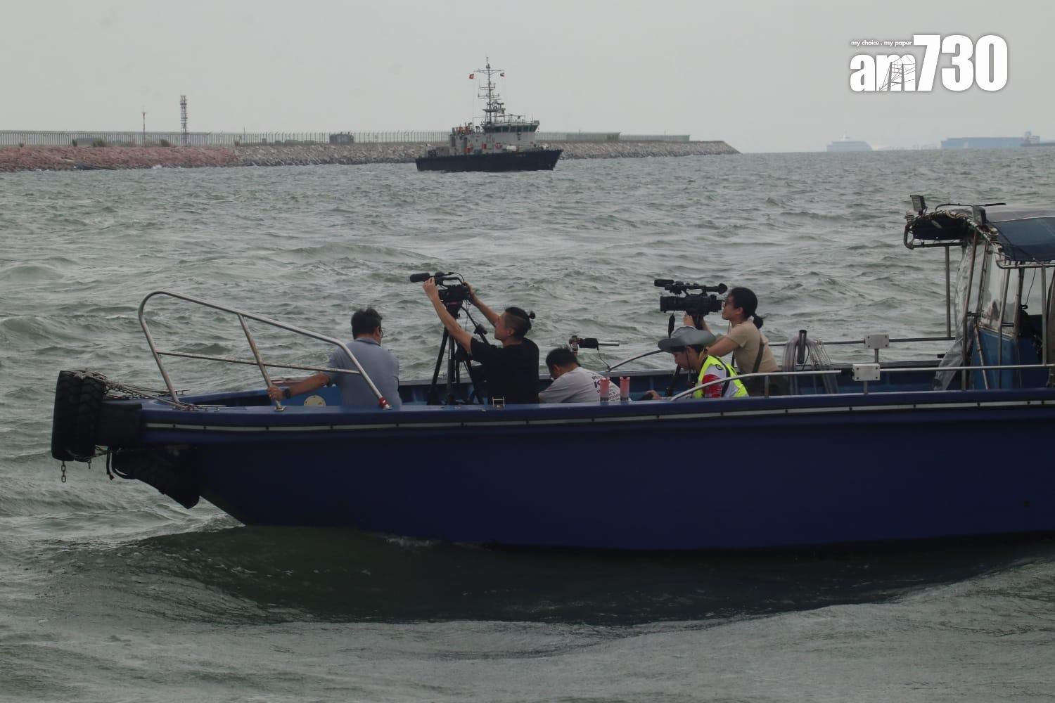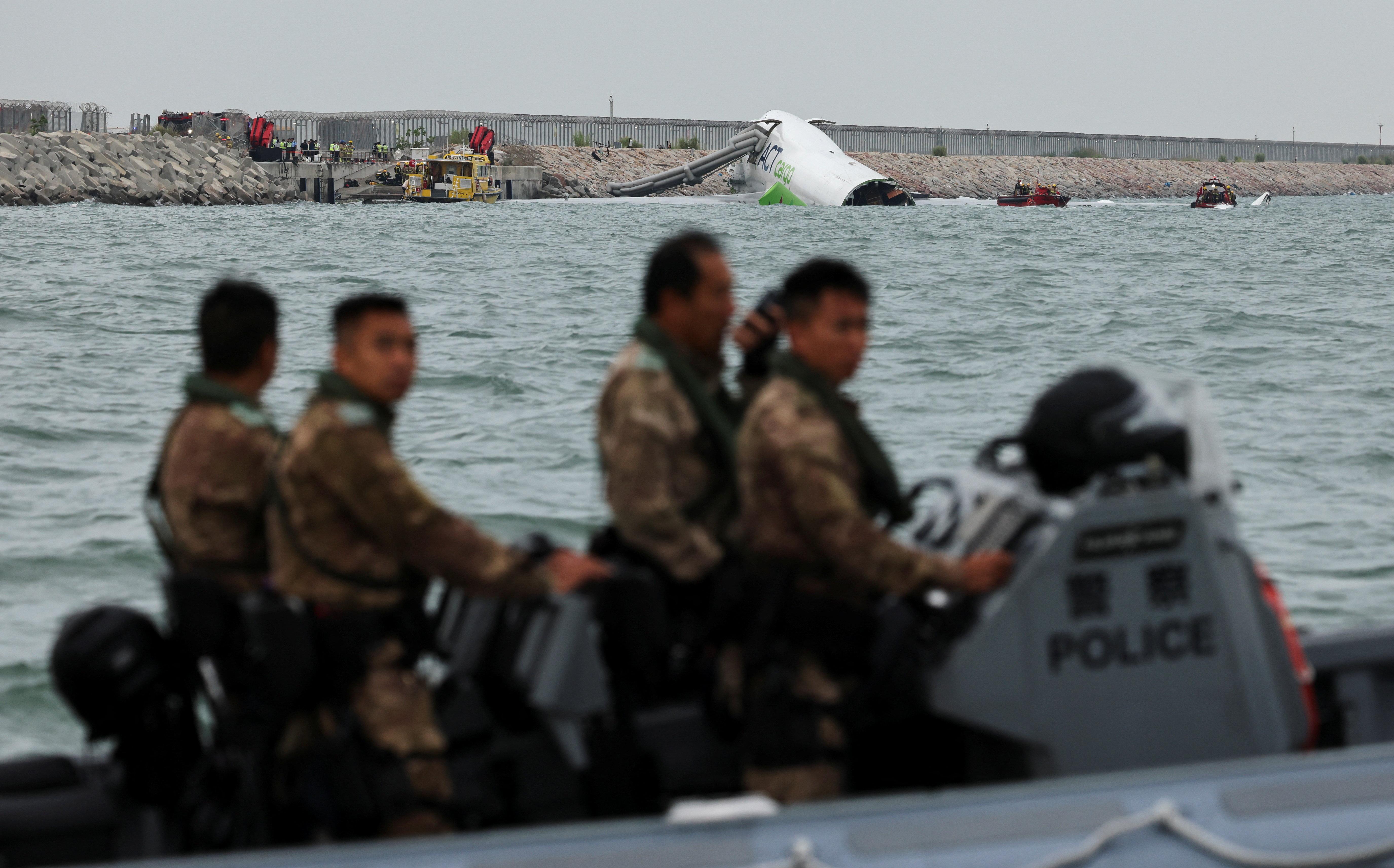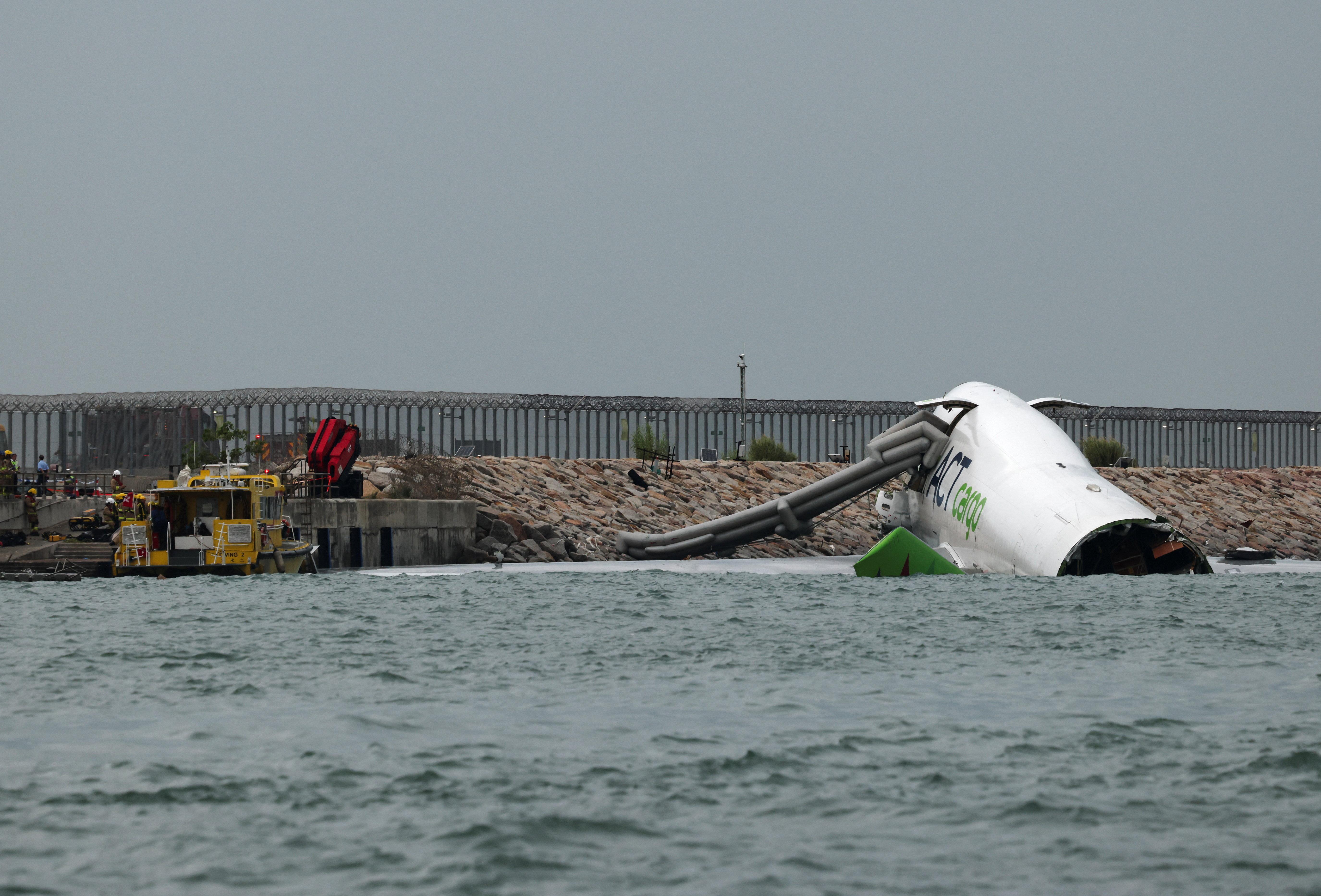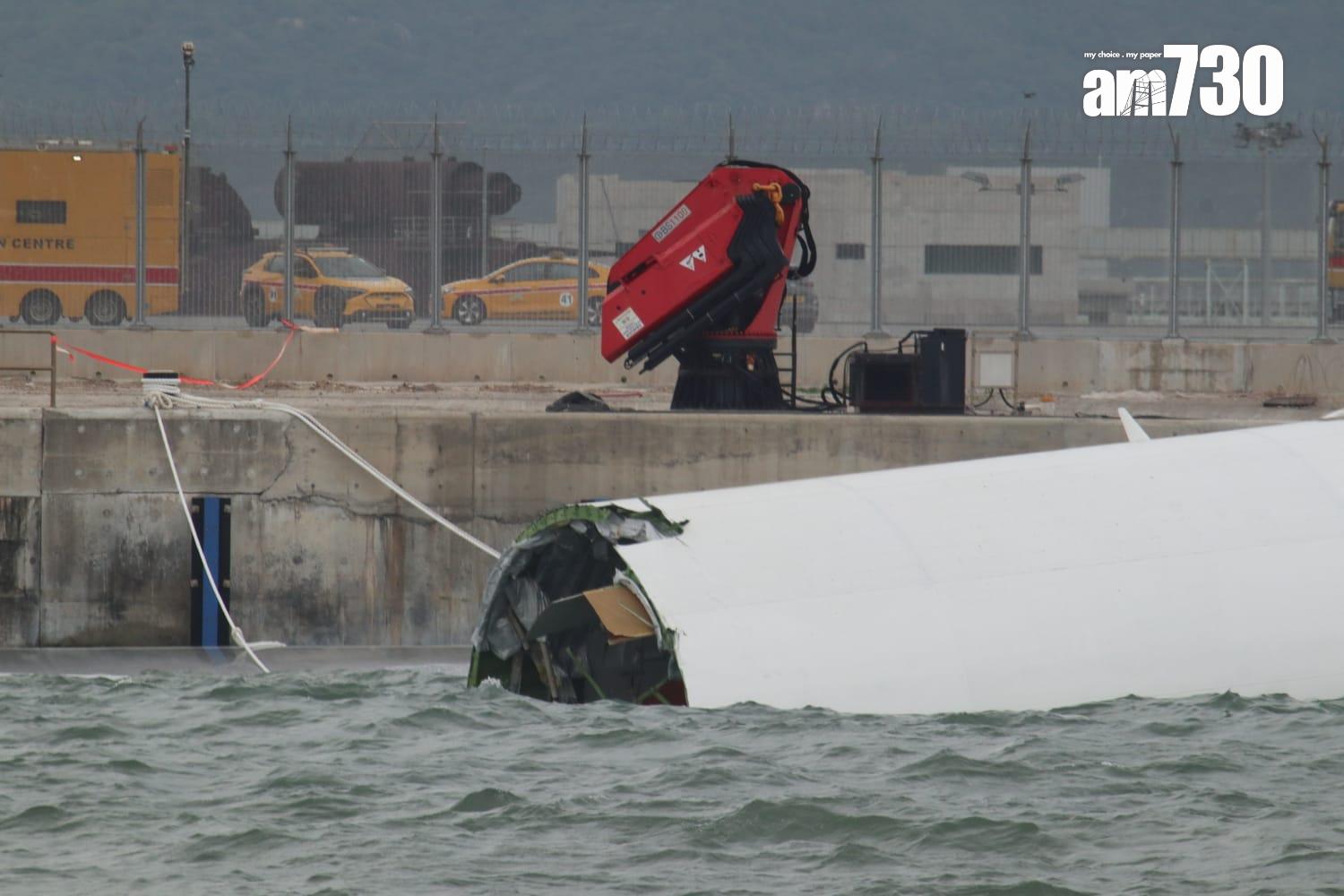 杜拜抵港貨機衝出跑道半機身墮海,地勤車被撞落海,兩男救起不治。(鍾式明攝)