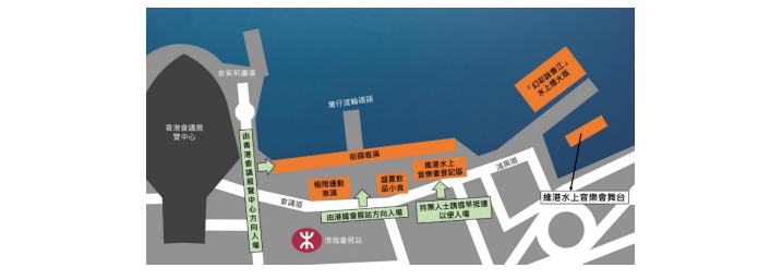 港鐵會展站 A3 出口,經天橋步行約 5 分鐘;香港會議展覽中心步行約 10 分鐘。請 跟隨現場示進場;「樂聚維港嘉年華」會場不設停車泊位,入場人士請使用公共交通。詳情按此