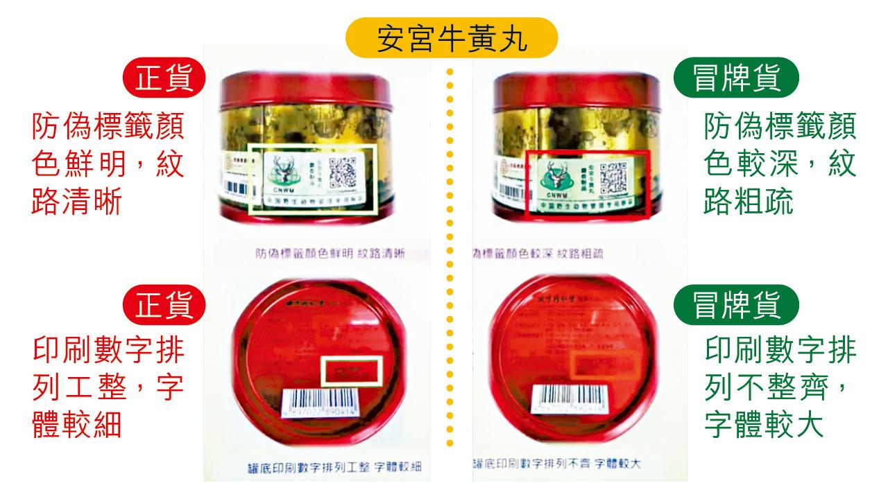 至於安宮牛黃丸,真貨的「防偽標籤」顏色鮮明,紋路清晰,罐底有效日期及批次號碼印刷數字排列工整,字體較細;假的「防偽標籤」顏色較深,紋路粗疏,罐底有效日期及批次號碼印刷數字排列不整齊,字體亦較大。