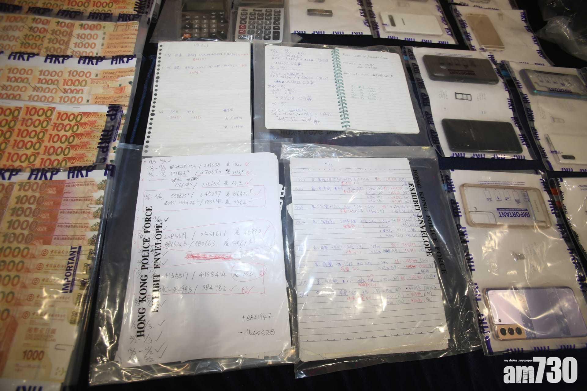 在行動中檢獲的大批電話、電腦、點鈔機及其他銀行文件。