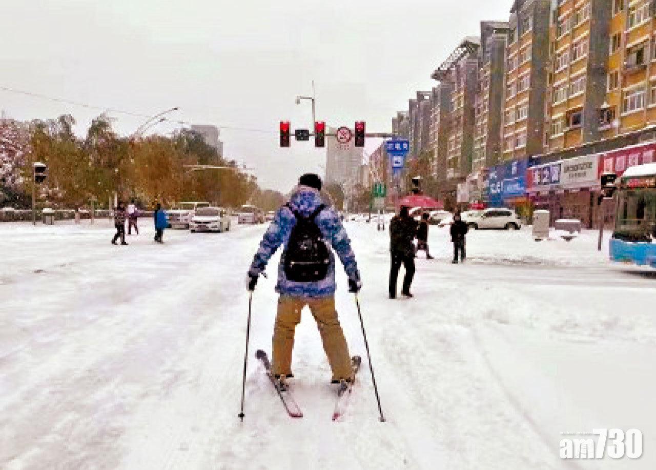 遼寧鞍山市民昨徒步上下班,有人直接滑雪。(互聯網)