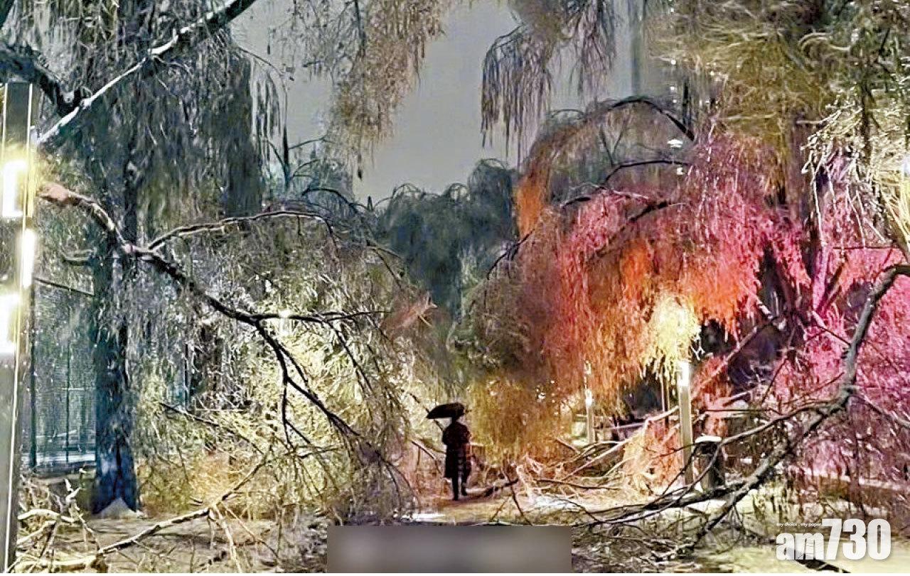 黑龍江哈爾濱昨中午由大雪轉為大凍雨,不少樹枝結冰後折斷。(互聯網)