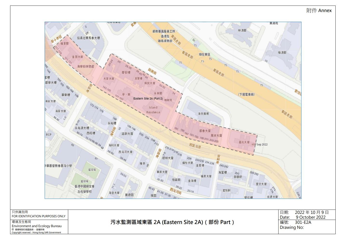 興民街與筲箕灣道附近一帶住宅(紅色範圍),污水檢測出病毒量相對較高。(政府新聞處)