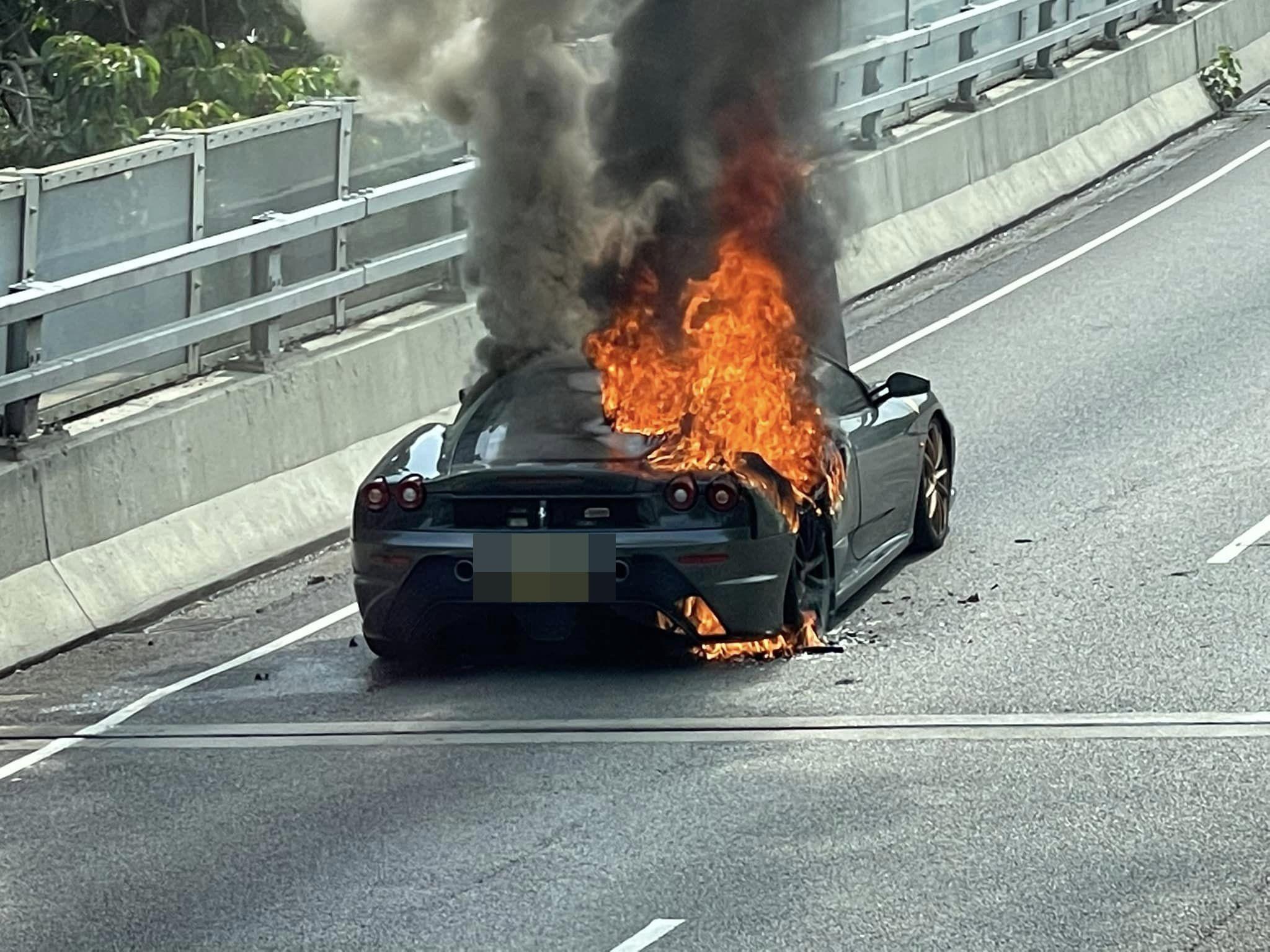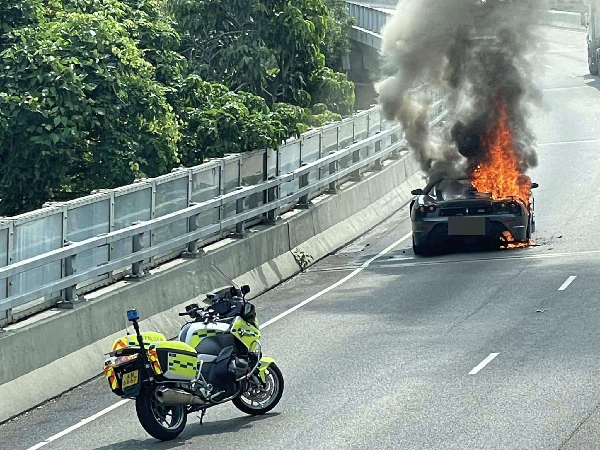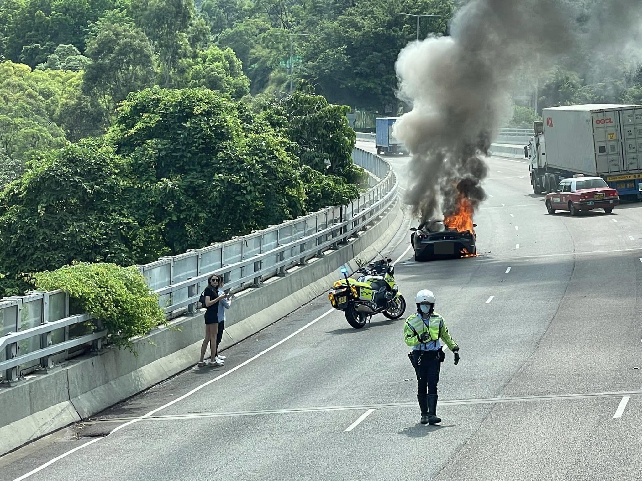 一輛法拉利在城門隧道公路起火。(香港突發事故報料區@fb圖)