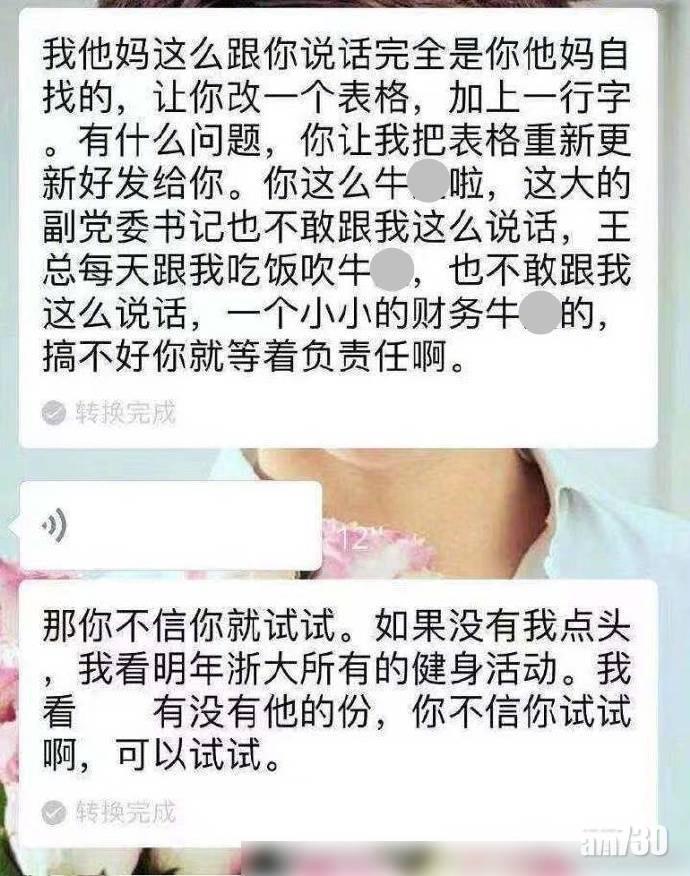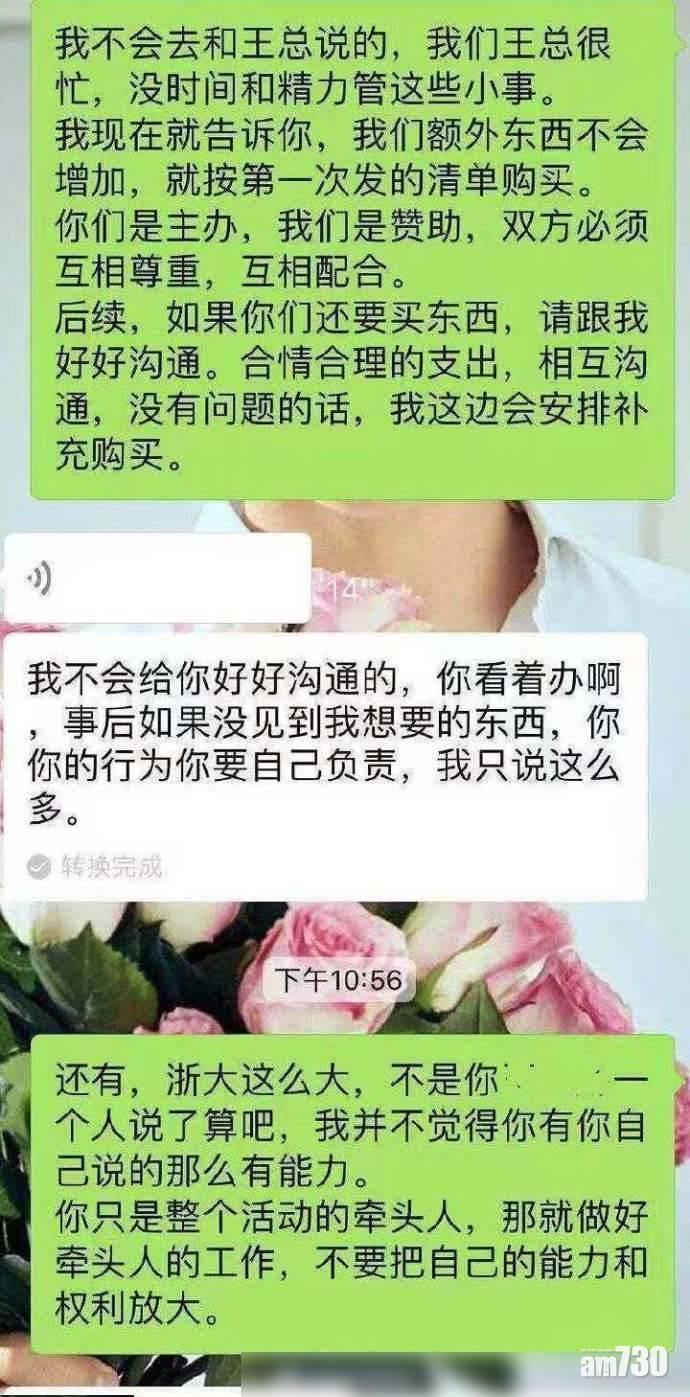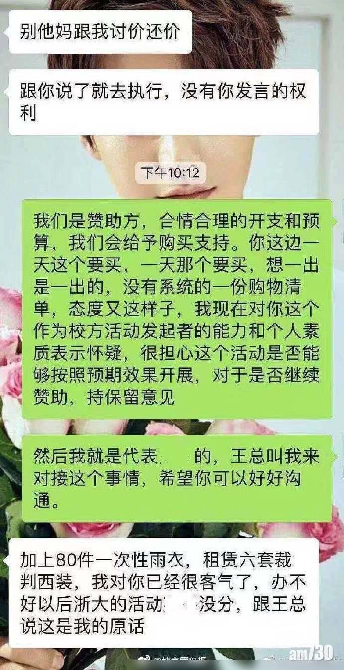 贊助商代表直斥,「浙大這麼大,不是你XX(人名)一個人說了算吧……你只是整個活動的牽頭人,不要把自己的能力和權利放大」,未料該名學生幹部放狠話,稱「那你不信你試試,如果沒有我點頭,我看明年浙大所有的健身活動,我看XX(公司名)有沒有他的份」。