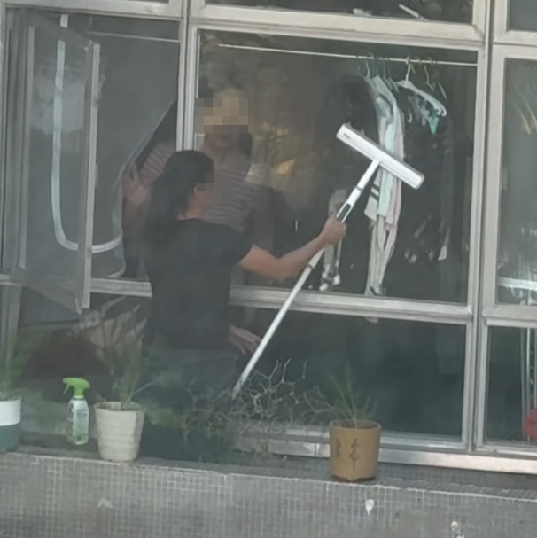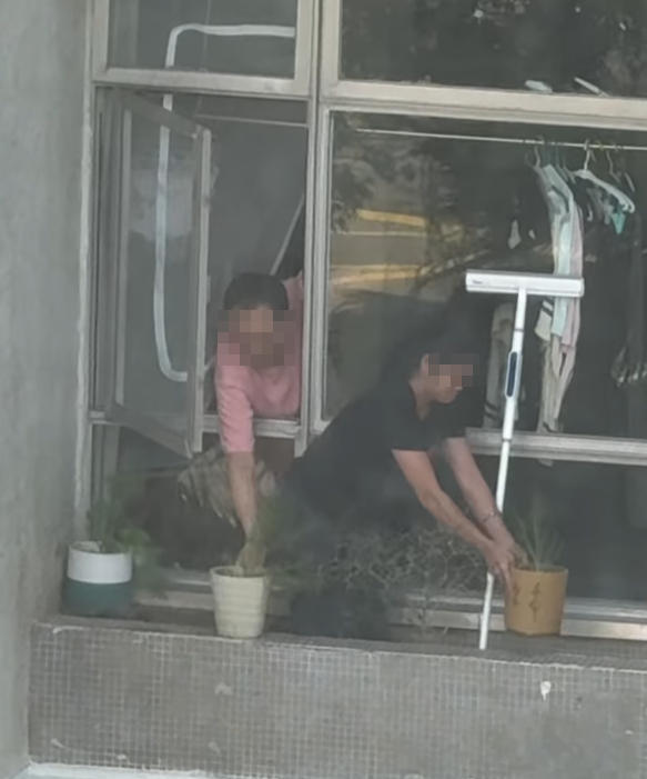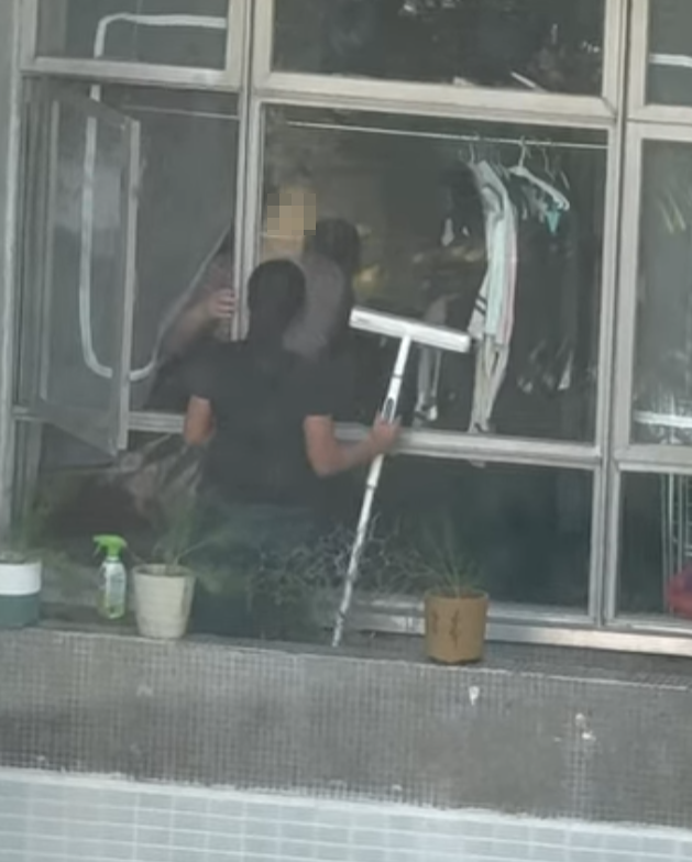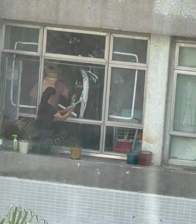 facebook群組「海怡半島討論區」周四有網民拍得影片,指海怡半島第二期有樓宇的1樓有外傭危企窗外花槽抹窗,「僱主企喺窗邊指點姐姐點樣抹窗,花盆放喺花槽邊」,影片可見一名外傭站於窗外的花槽位置,沒有做任何安全措施下以家用清潔伸縮杆抹窗,單位內一位年長婦人則指點對方抹窗位置,期間外傭更單腳站於花槽邊借力,左手緊握窗框,右手以伸縮杆抹較高位置的外窗,場面驚險,及後單位內另一位年長男子指示外傭把放於旁邊的花盆放回原本位置,影片可見涉事單位在1樓,距地面行人位置達數米。