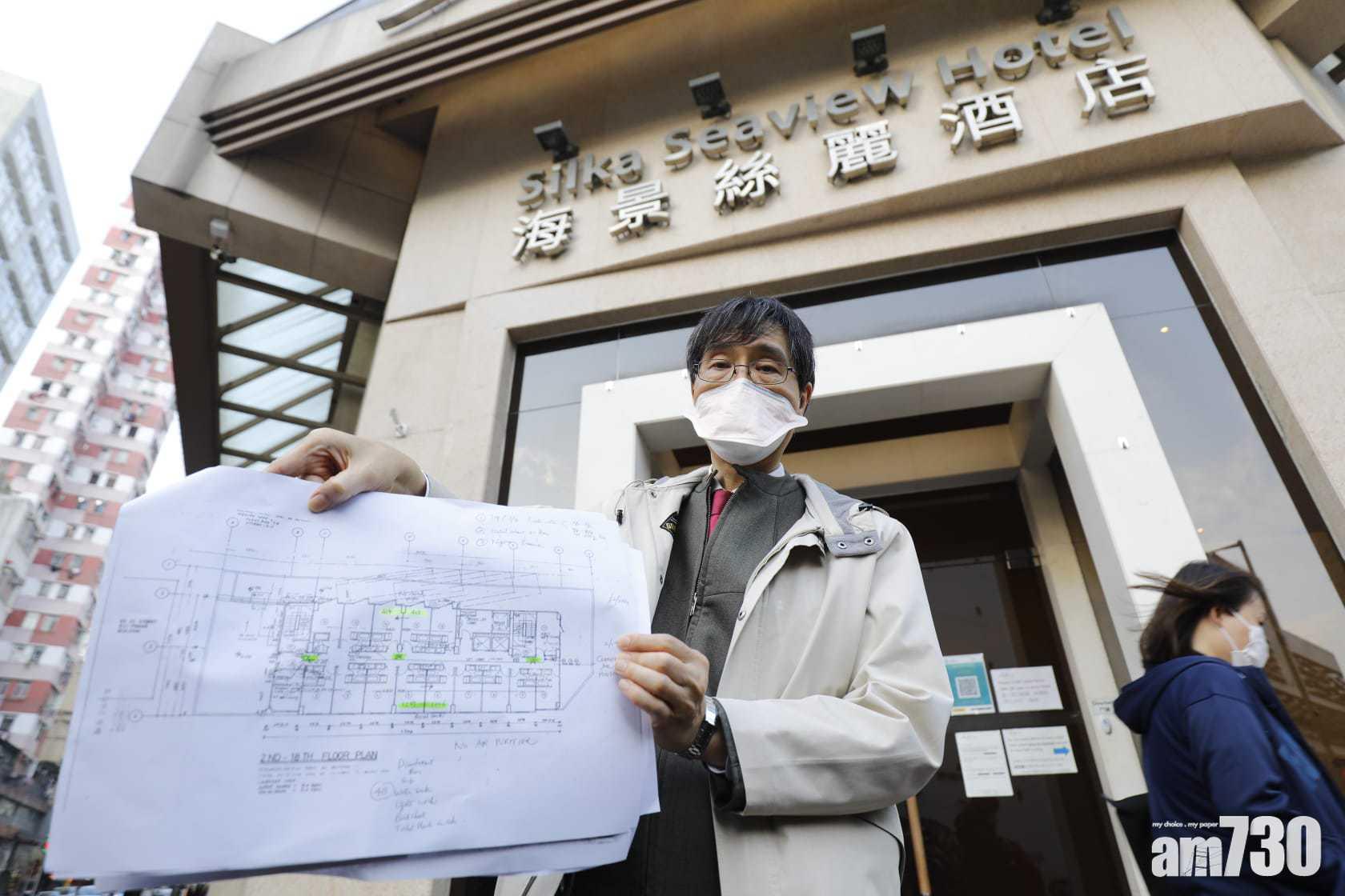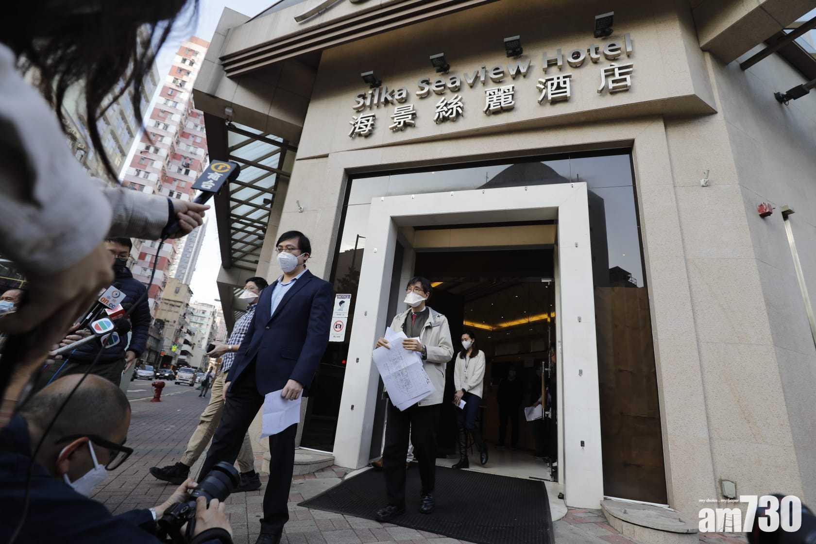 指定檢疫酒店、油麻地香港海景絲麗酒店出現多宗確診個案,其中4樓及12樓有相連房間住客確診,政府專家、港大微生物學系講座教授袁國勇與衛生防護中心人員,下午到場視察,發現酒店內兩個樓層樓,出現相鄰房間交叉感染。