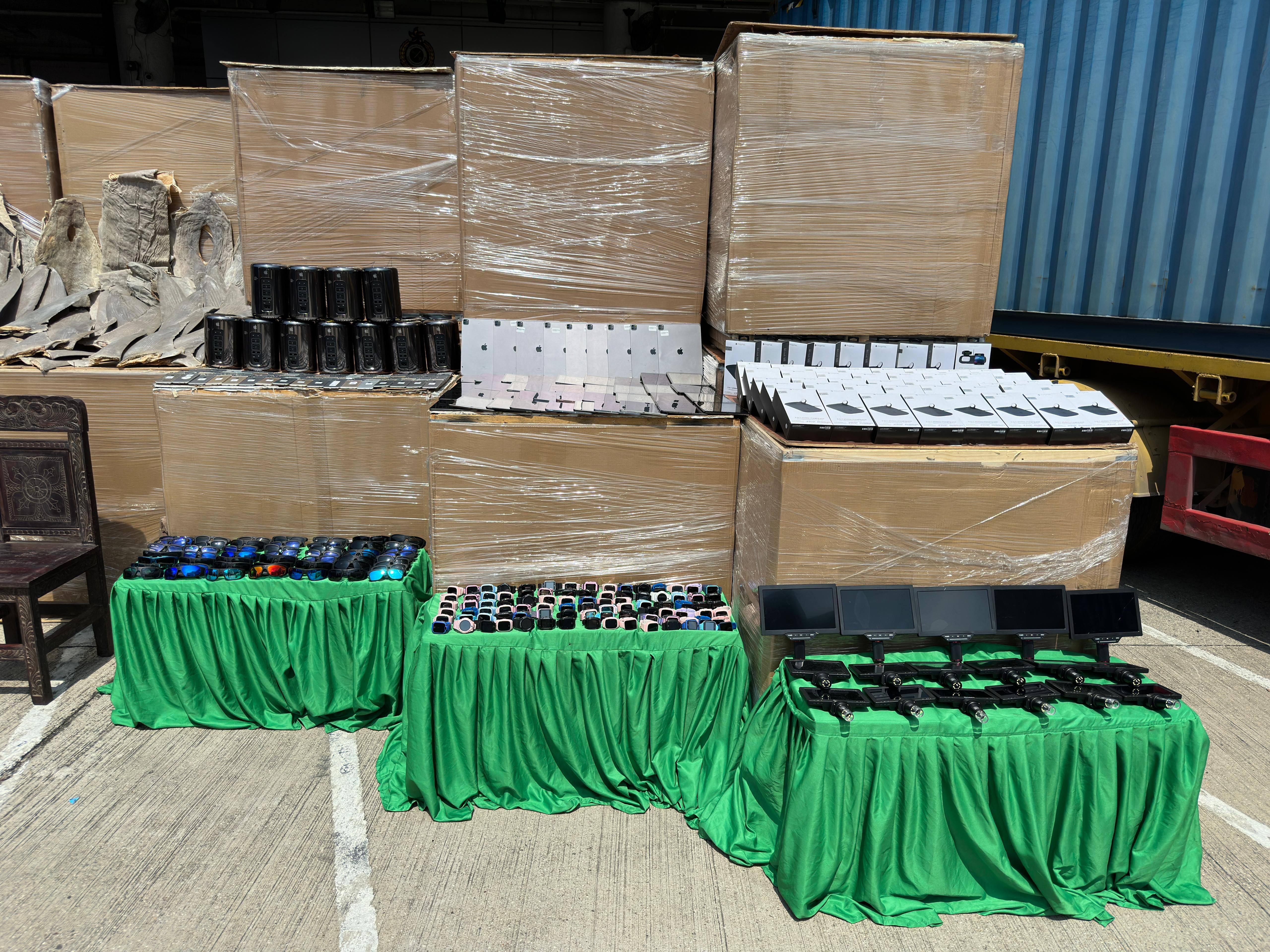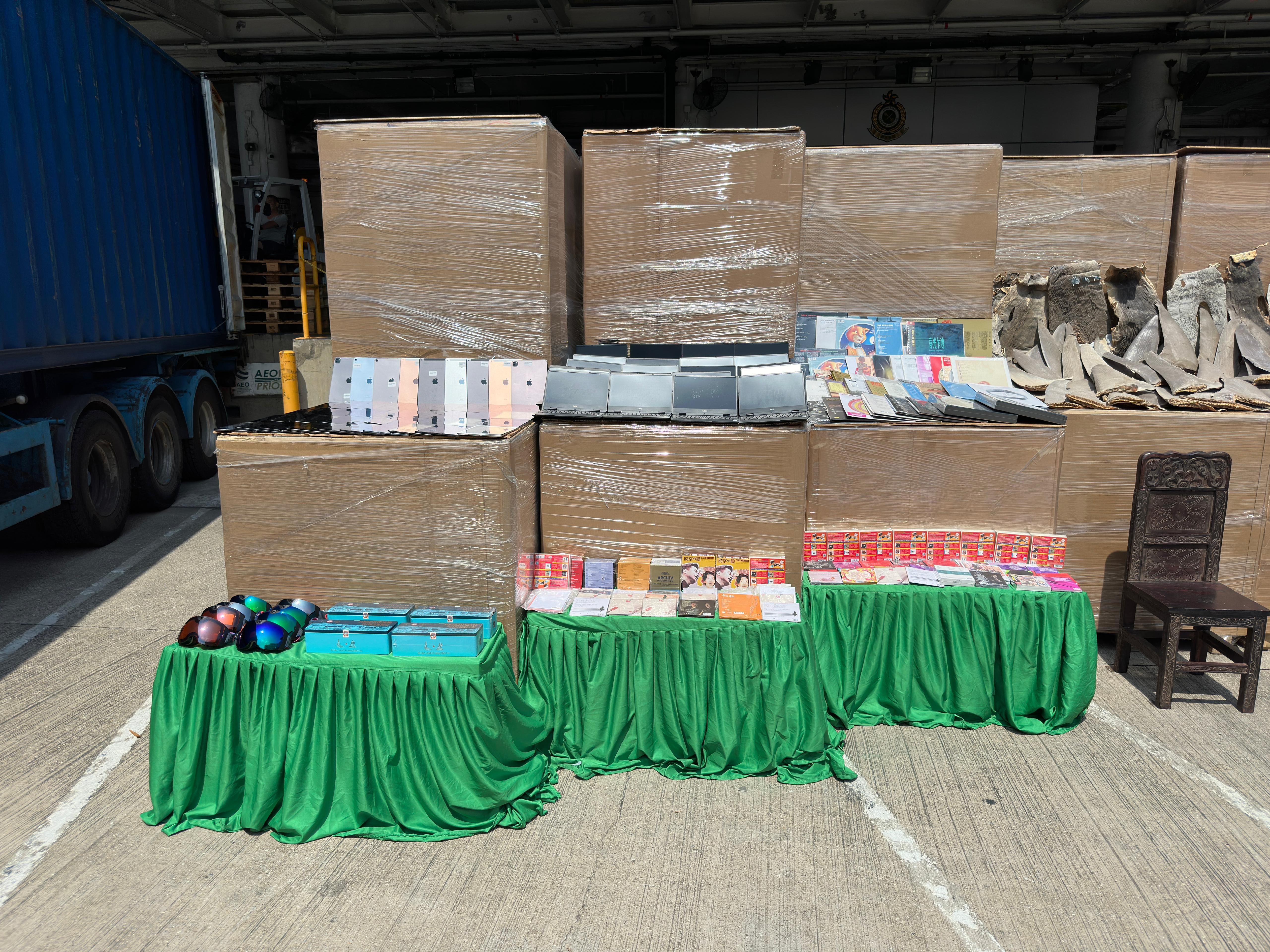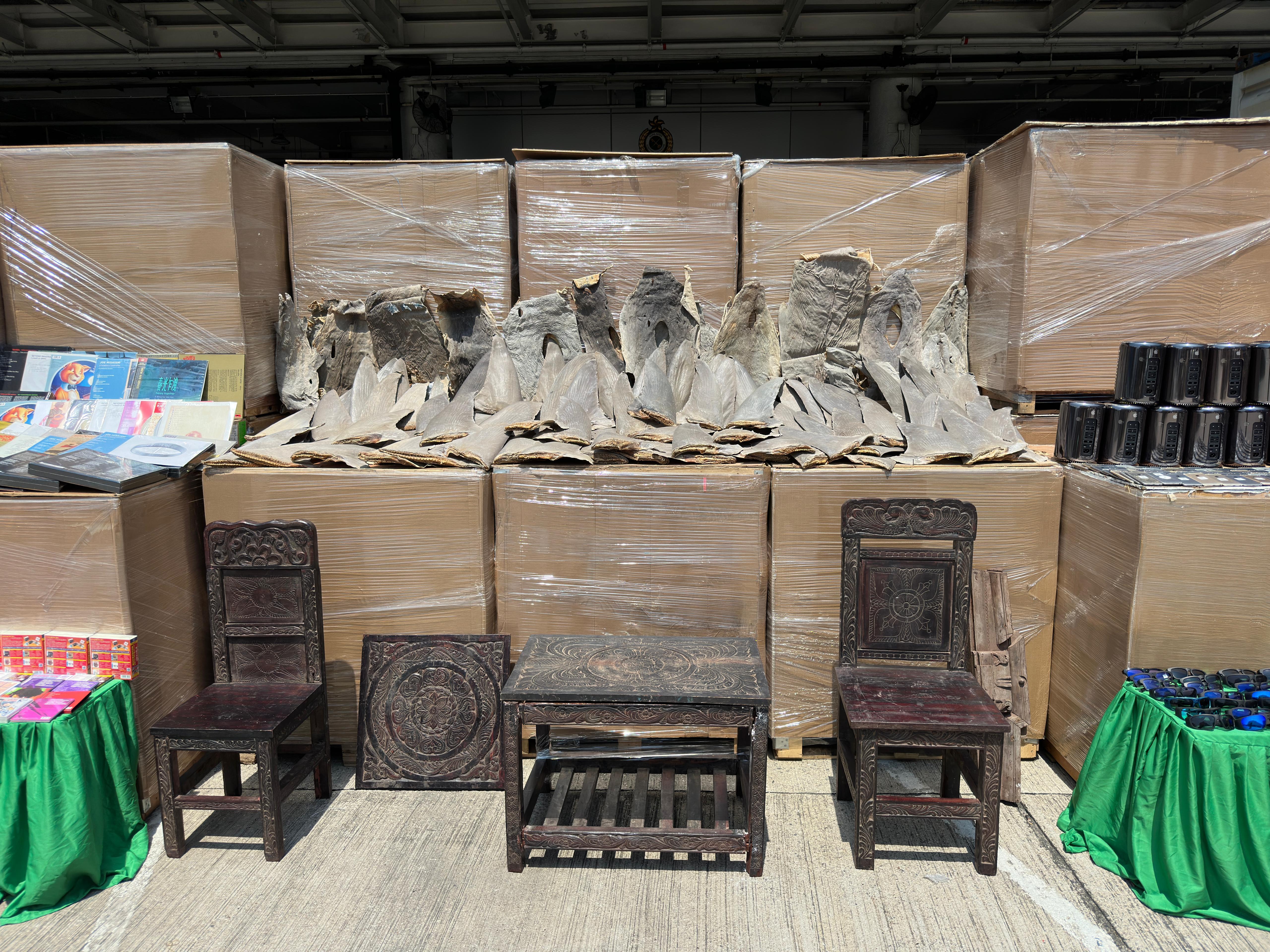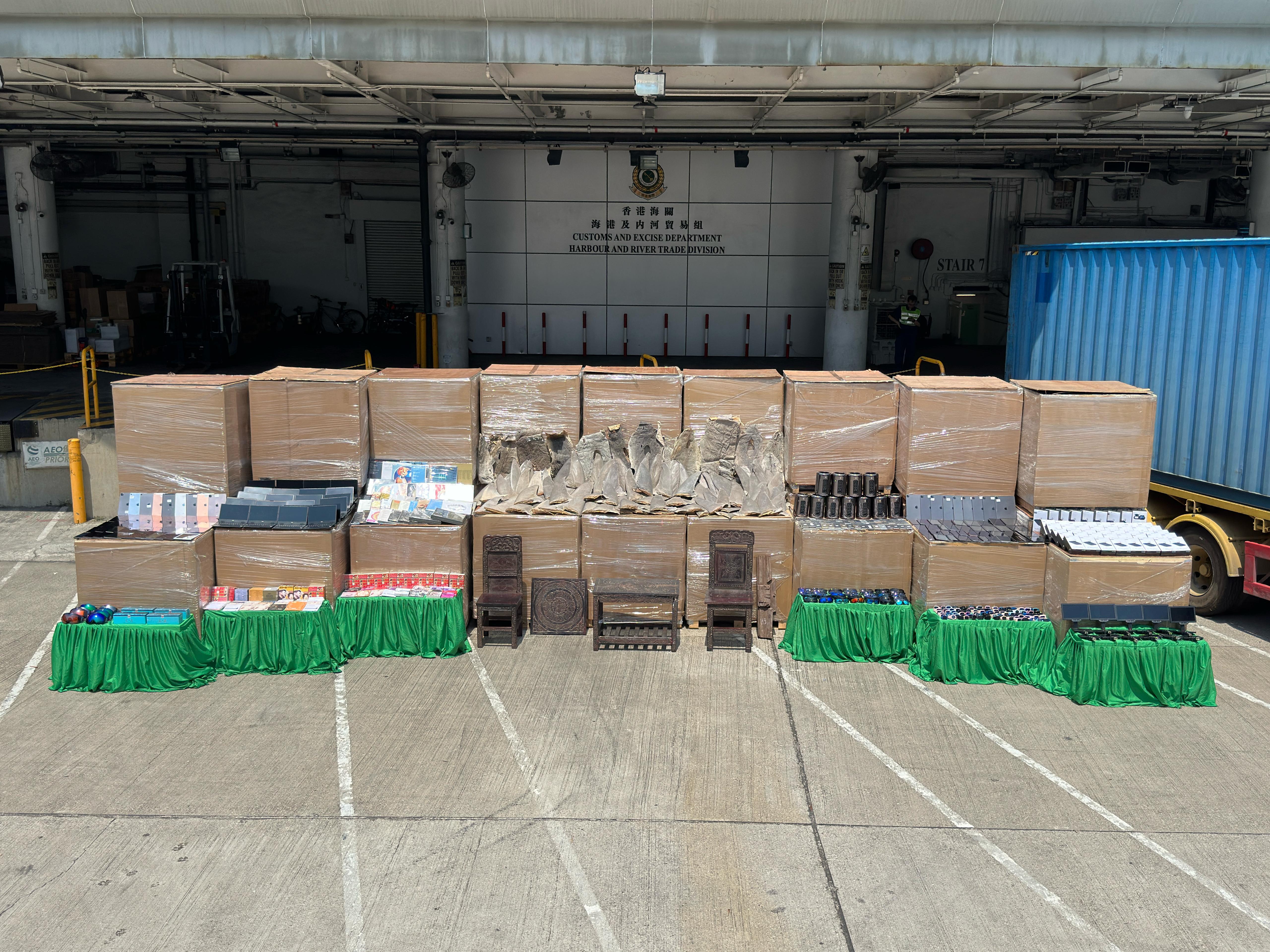 海關五月七日在葵涌貨櫃碼頭偵破一宗涉嫌利用遠洋船走私貨物往台灣的案件,在兩個貨櫃內檢獲大批未列艙單貨物,包括懷疑受管制乾魚翅和鯊魚皮、懷疑受管制木製傢具、電子零件和電子產品,估計市值約一億六千萬元。