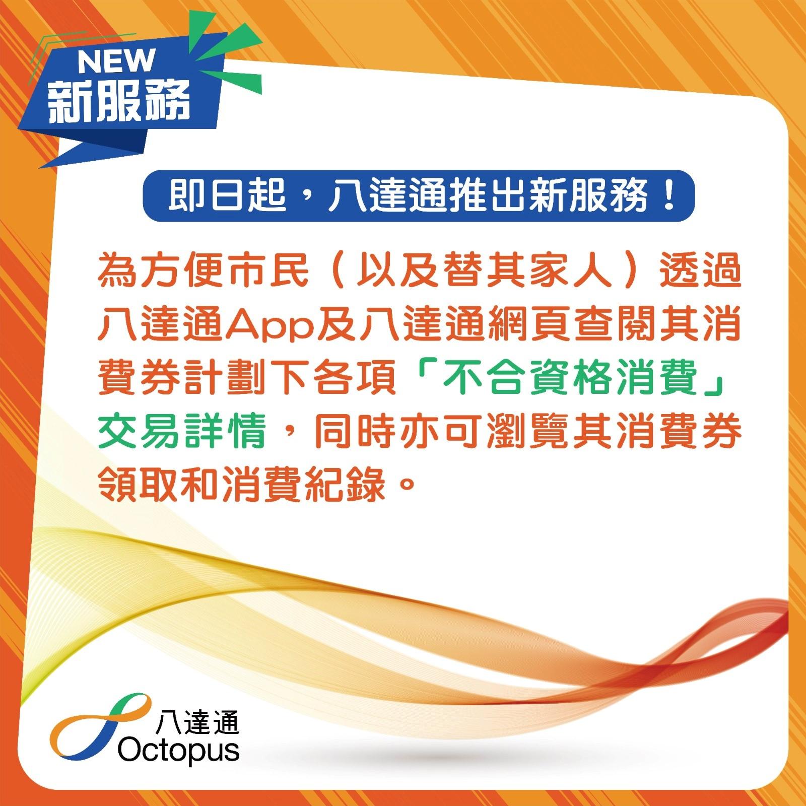 八達通宣布,由今日起推出新服務,為方便市民查看消費紀錄是否符合資格,現在可透過八達通App及八達通網頁查閲其消費券計劃下各項「不合資格消費」交易詳情。換言之,在八達通上的消費紀錄可進入app便一覽無遺,「合格」與「不合格」的紀錄均會列出,同時亦可瀏覽其消費券領取和消費紀錄。