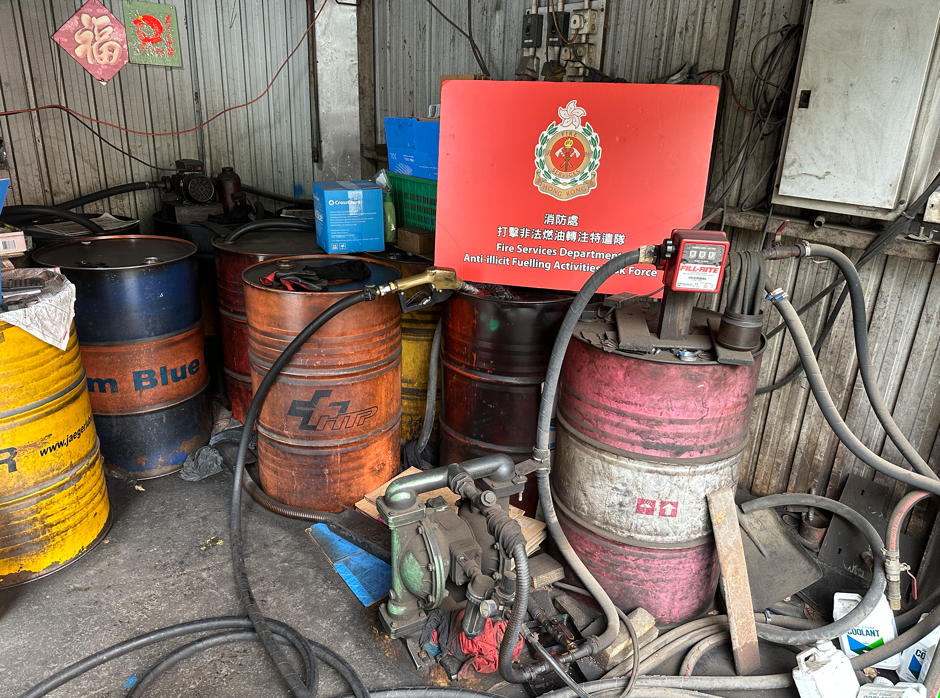 消防處指,行動中人員發現一個未獲處方批准的貯油缸及大批入油工具,並截獲一名男子,涉嫌違反《危險品條例》、《危險品(管制)規例》及《消防(消除火警危險)規例》並將其檢控。
