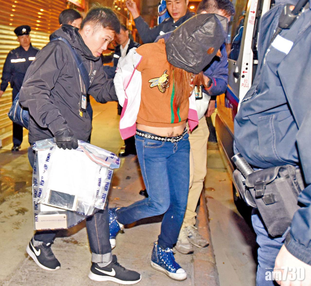 女疑犯被黑布蒙頭帶返警署。