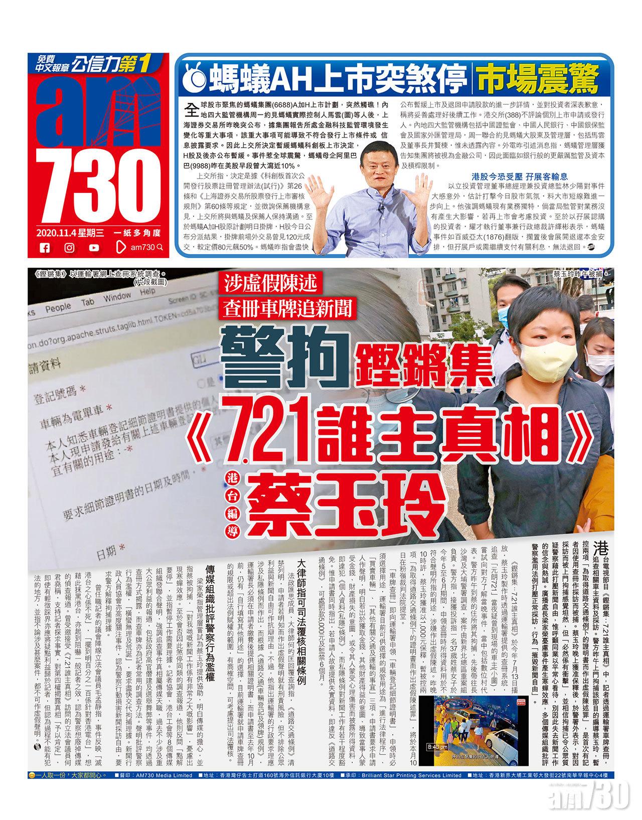 《鏗鏘集:7.21誰主真相》於今年7月13日播放,蔡玉玲製作時透過運輸署提供的查冊系統,追查「元朗721」當夜疑曾到現場的車主(圖),嘗試向對方了解當晚事件,當中包括數位村代表。警方昨午到蔡的住所將其拘捕,先後帶往長沙灣及大埔警署調查,案件由新界北總區重案組負責。警方指,接獲投訴指一名37歲姓蔡女子於今年5至6月期間,申領查冊時所得資料用於不符合聲明所指的用途,涉嫌作出虛假陳述。昨晚10時許,蔡玉玲獲准以1,000元保釋,暫被控兩項「為取得道路交通條例下的證明書而作出虛假陳述罪」,將於本月10日在粉嶺裁判法院提堂。