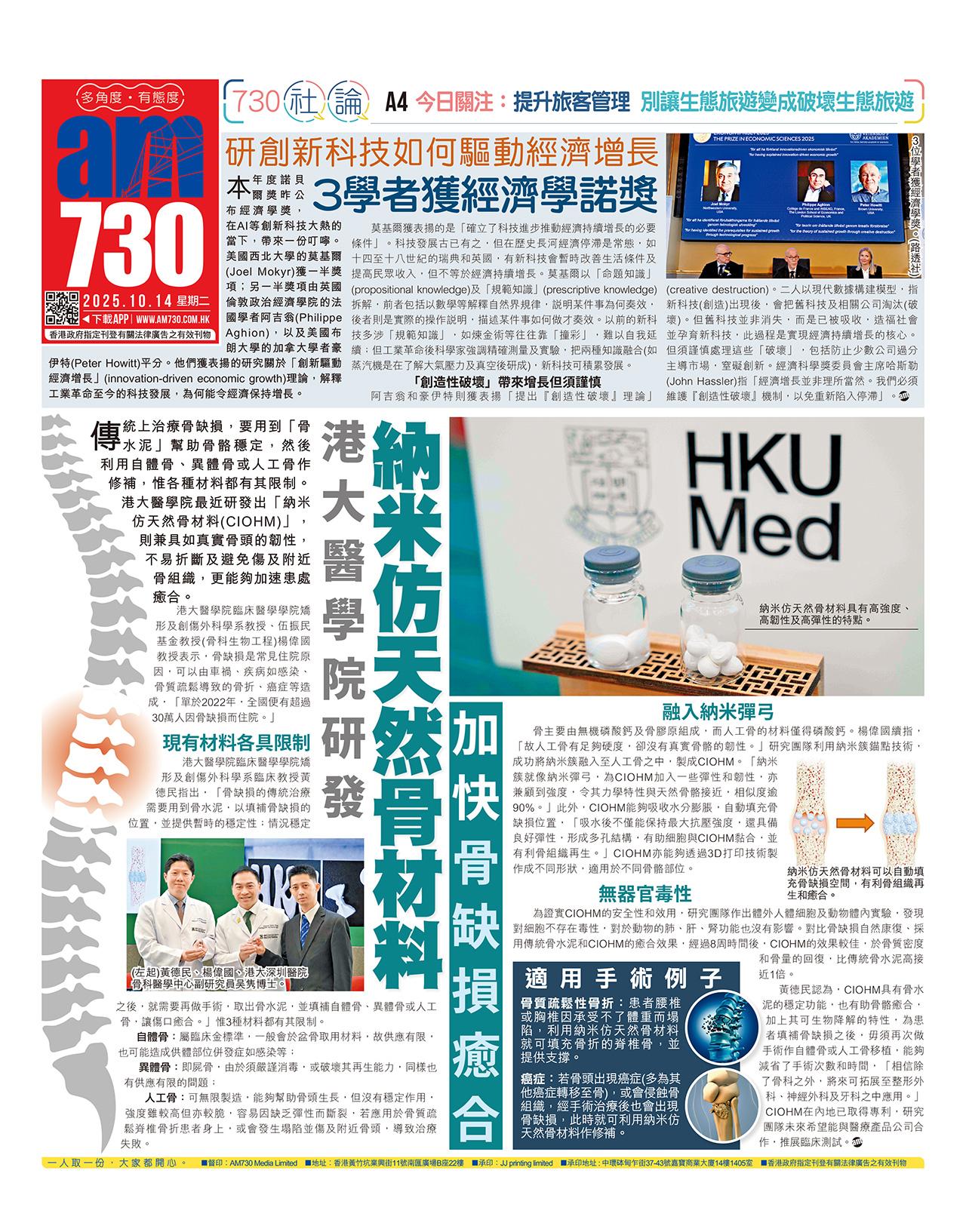傳統上治療骨缺損,要用到「骨水泥」幫助骨骼穩定,然後利用自體骨、異體骨或人工骨作修補,惟各種材料都有其限制。港大醫學院最近研發出「納米仿天然骨材料(CIOHM)」,則兼具如真實骨頭的韌性,不易折斷及避免傷及附近骨組織,更能夠加速患處癒合。