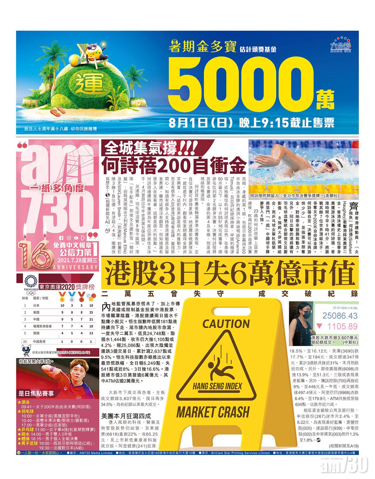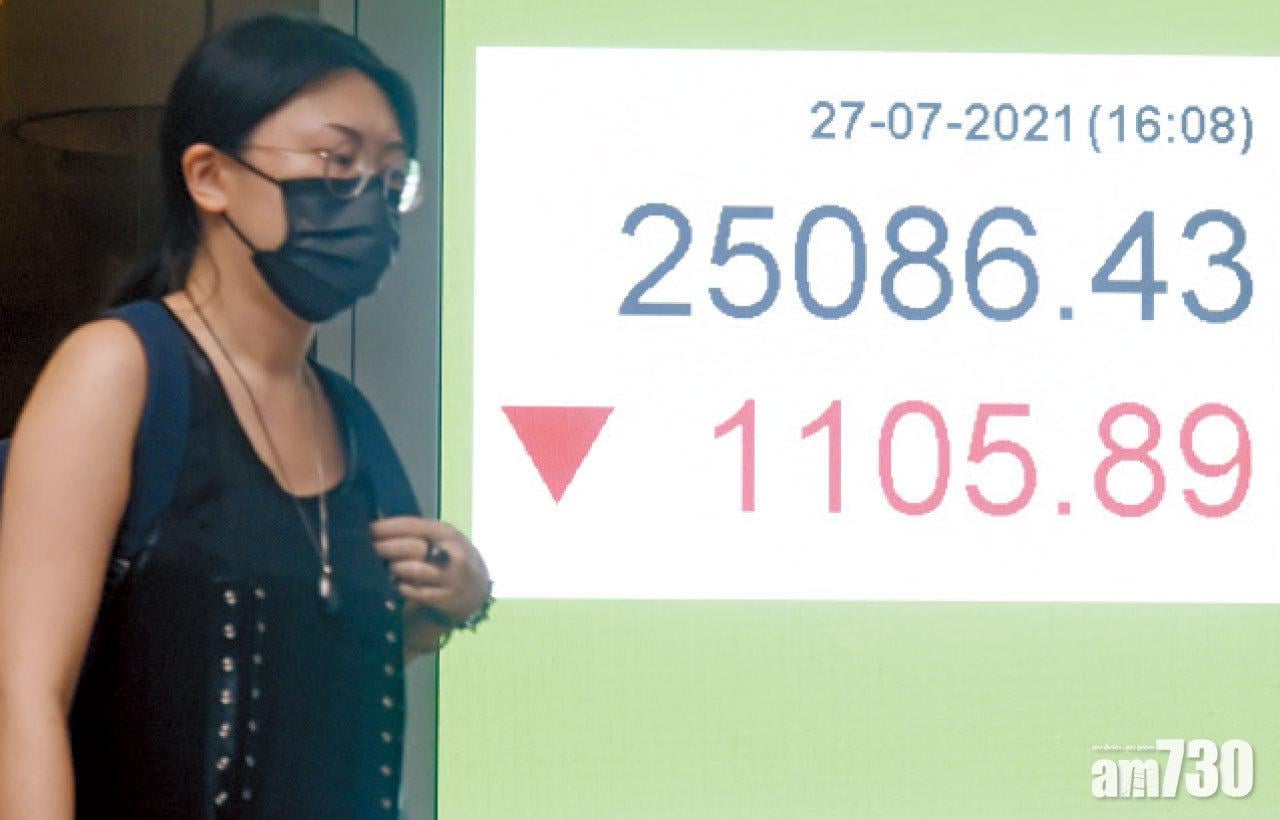 內地監管風暴恐慌未了,加上市傳美國或限制基金投資中港股票,市場籠罩陰霾,港股連續兩日插水千點爆小股災。恒生指數昨低開181點後持續向下走,尾市隨內地股市急瀉,一度失守二萬五、低見24,748點,勁插水1,444點,收市仍大挫1,105點或4.2%,報25,086點,出現大陰燭並連跌3個交易日,累計瀉2,637點或9.5%。恒生科技指數亦錄推出以來最恐慌跌幅,全日報6,249點,失541點或近8%,3日挫16.6%。港股總市值3日蒸發逾6萬億元,其中ATM佔逾2萬億元。
