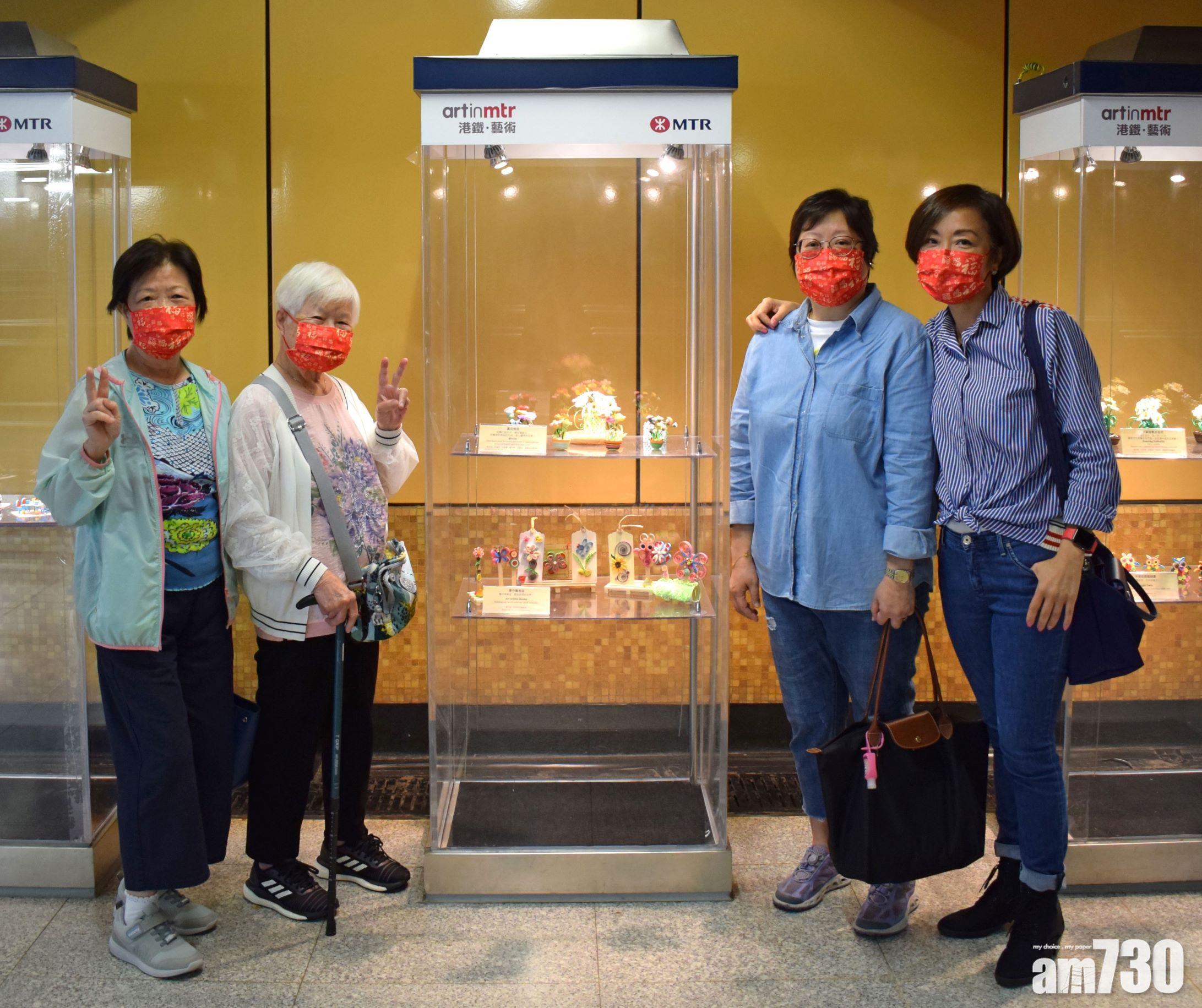 利駿行慈善基金主席麥淑儀女士(右)、捲紙製作導師(右二)及參與的長者,對作品在港鐵站展出感到高興。(港鐵提供)