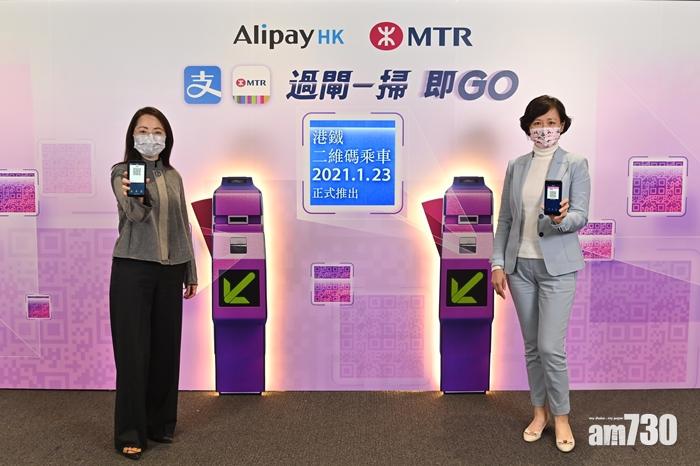港鐵商務總監楊美珍(右)及Alipay HK行政總裁陳婉真(左)宣布下月推出港鐵二維碼付費乘車服務。