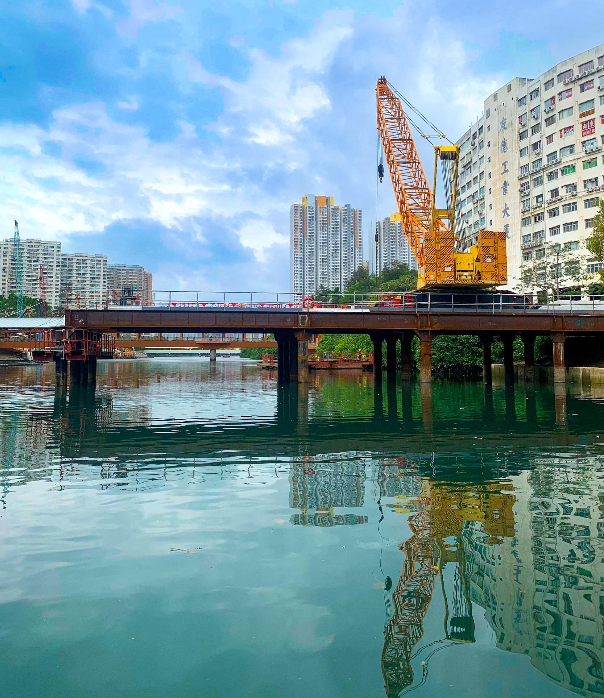 在施工階段,河上搭建的臨時工作台亦盡量減少佔用河道,包括在可行情況下,部分臨時工作台以臨時樁柱架起,確保河水通過。團隊亦正建設跨河臨時施工通道,讓工程物料可以跨河直送至施工位置,減少路面運輸對交通的影響。由於部分工程鄰近屯馬綫屯門站,項目團隊已就相關工程進行風險評估,並制定周詳的施工及應變方案。