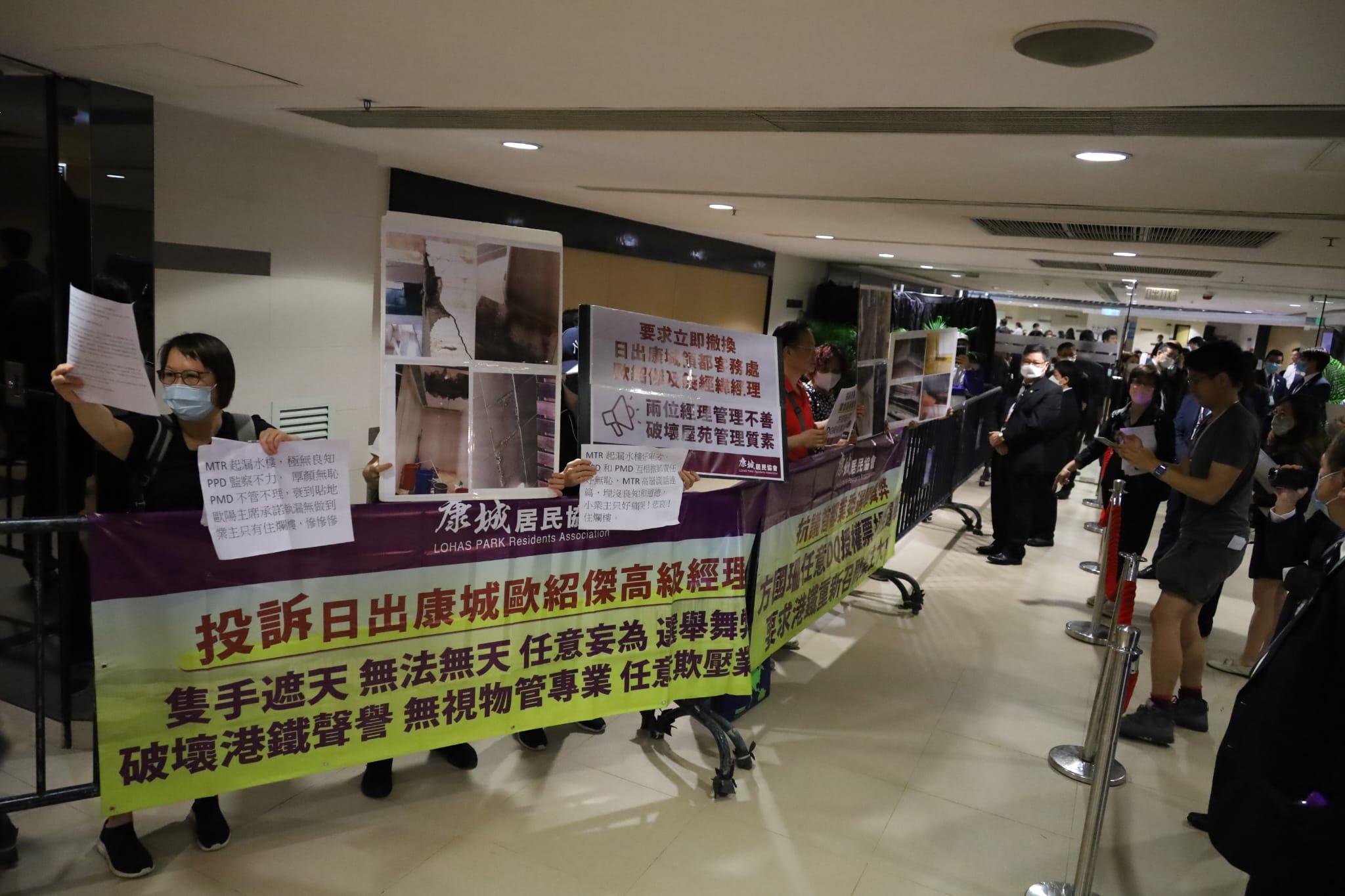 至於股東大會場外,有康城居民拉橫幅要求港鐵重開業主大會及關注港鐵管理公司問題,其後有抗議人士到記者室示威,被保安員要求離開。