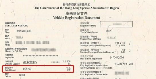 局方指車主可參考汽車「牌簿」上的「額定功率」,了解電動私家車的相關資料。(運輸及物流局fb圖)
